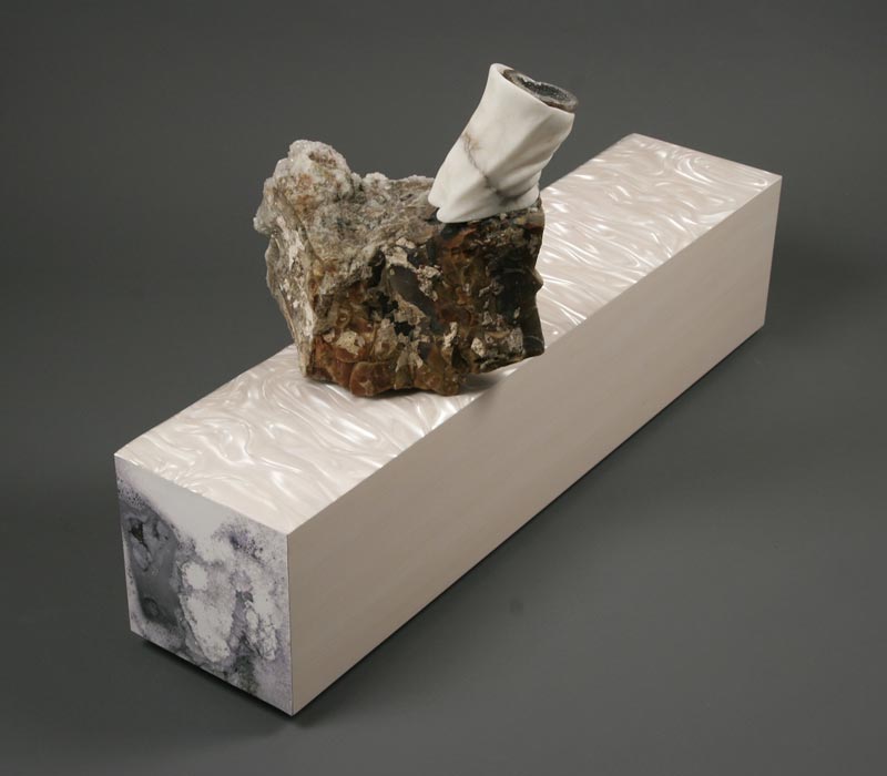 Hoping Something Pure Can Last (Obsession Interrupted) 2011, Petrified wood with crystals, alabaster, geode, snake skin, photo, plastic, 60 x 18 x 36 inches; $6,500 |
