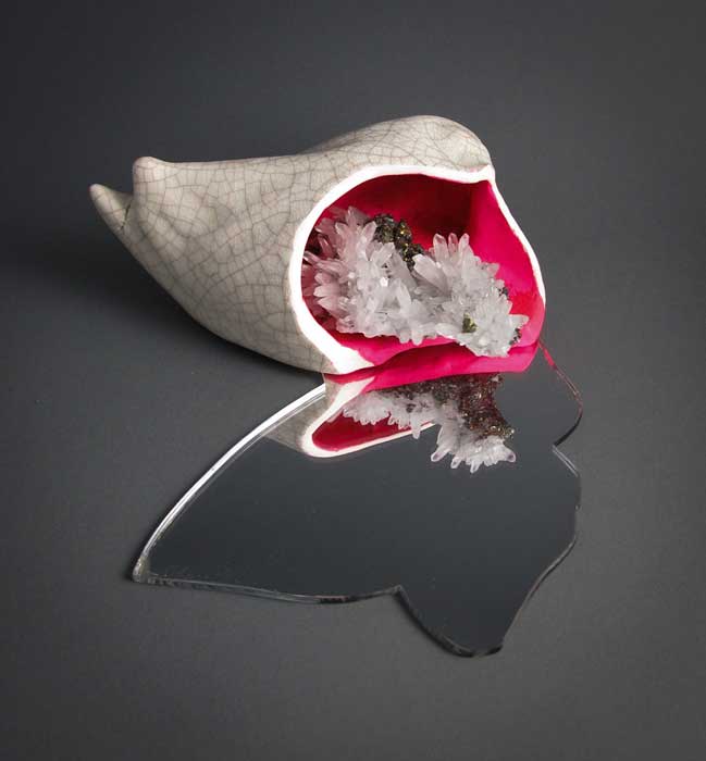 Pit of my chest 2011, Ceramic, mirror, quartz and pyrite crystal, 7 x 7 x 4 inches; $800 |