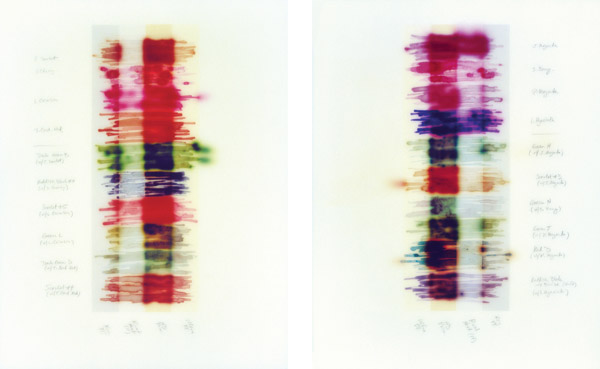 | Chart w/Reds & Mixes acrylic, stains and spray paint on wood panel, 18 x 30 inches total (diptych) • |