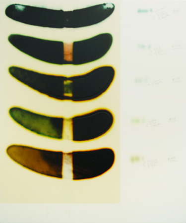 | Chart: 11 Stains/7 Whites acrylic, stains and spray paint on wood panel, 28 x 36 inches • |