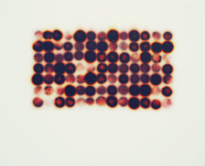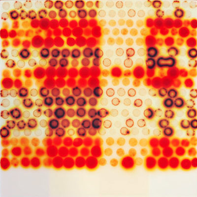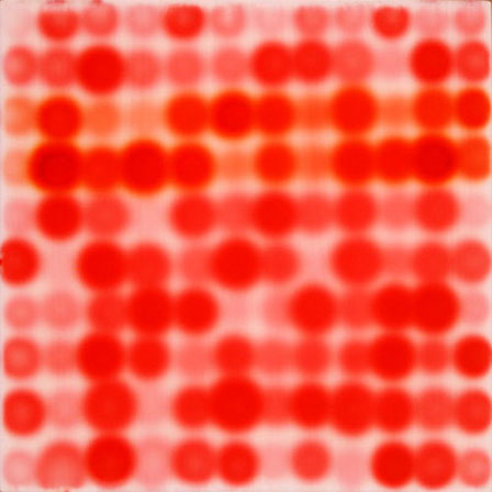 Density Test: 9 Reds acrylic, stains and spray paint on wood panel, 11 x 11 inches • |