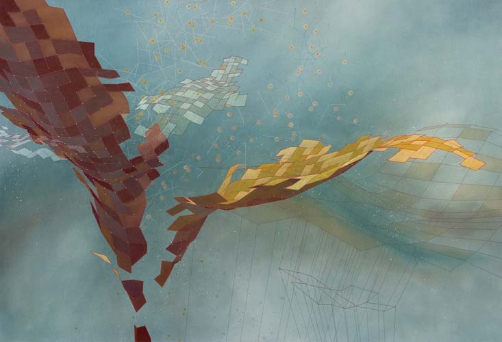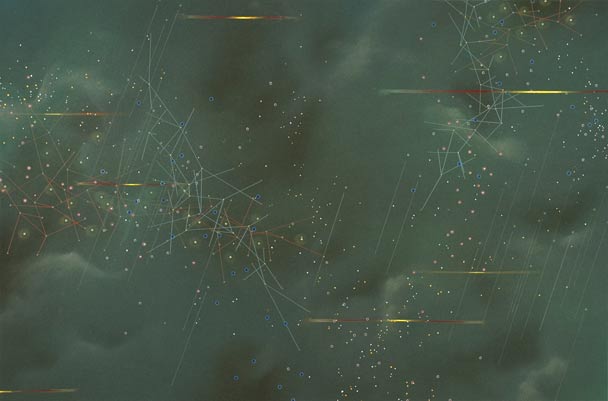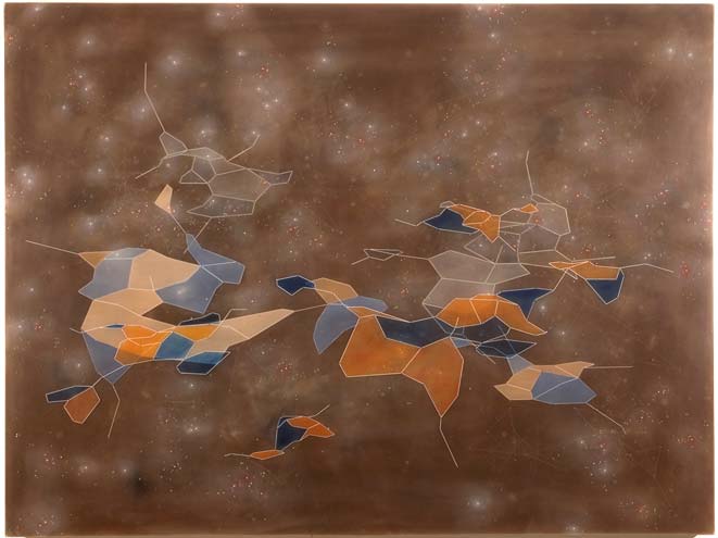 | Plane Drift, 2007, resin, dry pigment, ink, pencil, acrylic, spackle on panel 37 in x 49 in x 2.5 |