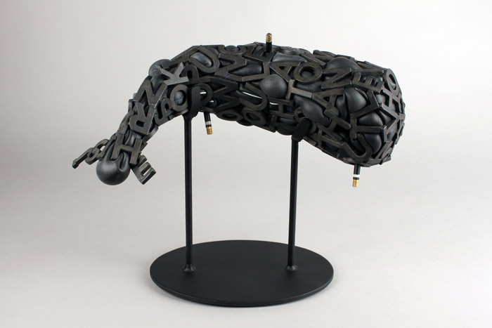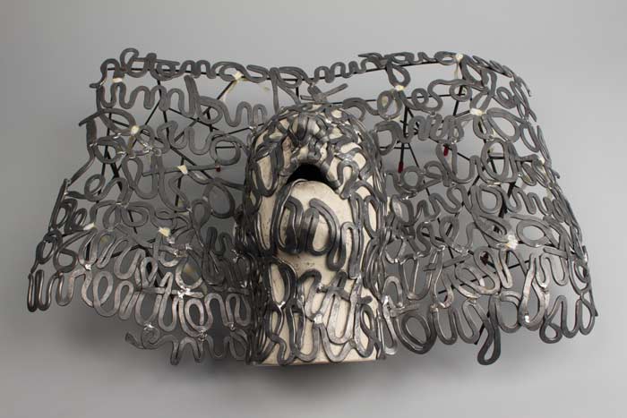 | Trouble Came, 2012, ceramic, lead, brass, rubber, cotton, carbon, 9 x 24 x19 inches, $3,400 LINK to detail images |