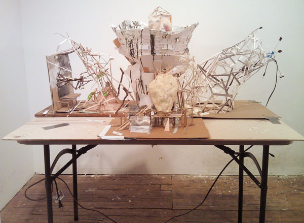Worktable (A Plea for Better Leaders in the Form of Automatic Sculpture) 2013, cardboard, paint, sticks, putty, xerox paper, ipod nanos, found material, 31 x 53 x 48 inches |