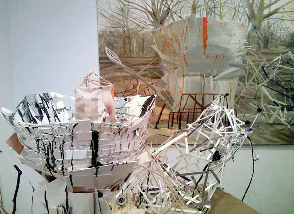 But My Heart is Wild and My Bones Are Steel 2013, cardboard, paint, sticks, putty, xerox paper, ipod nanos, found material, 31 x 53 x 48 inches |