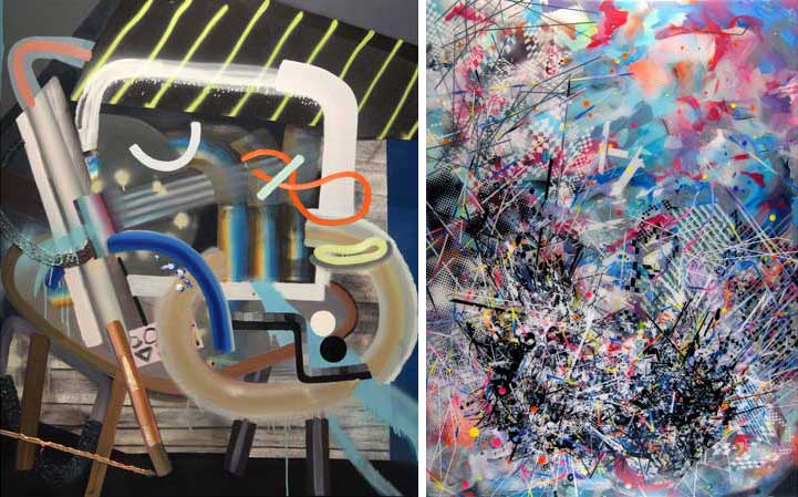 Right image: Mark Schoening, snowcrash, 2012, acrylic, latex, spray paint, silkscreen ink, and resin on panel 40 x 30 inches