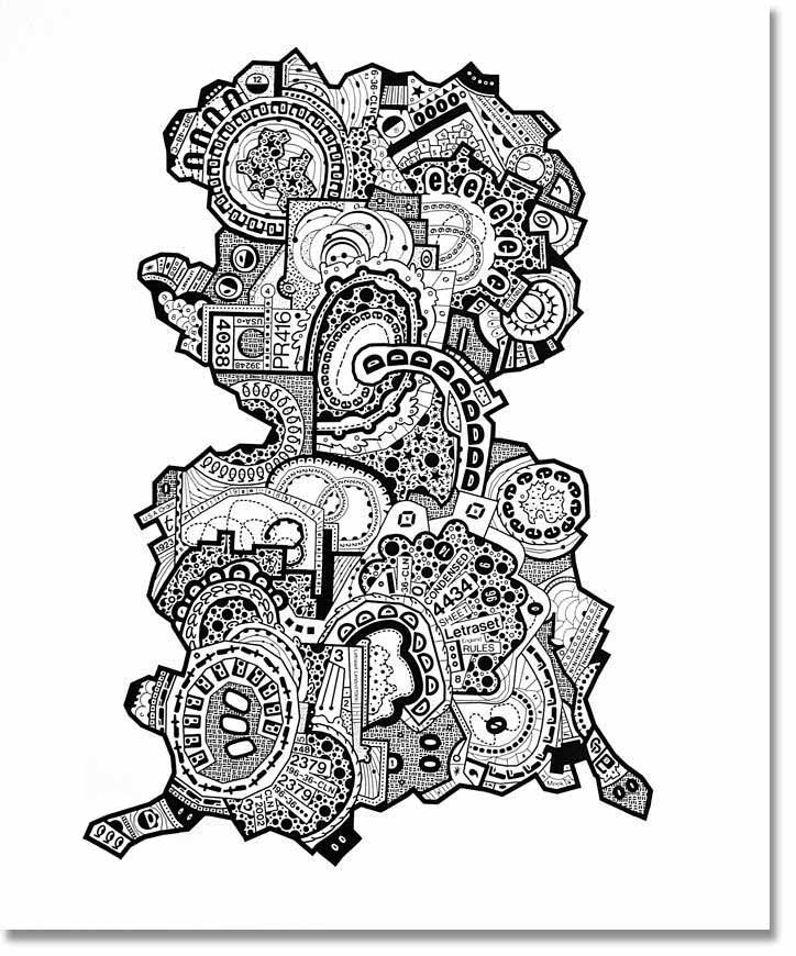 Kelly takes on the tedious task of rubbing down forms, shapes, patterns, and lettering from scores of Letraset sheets to create complex “drawings” which are rigorous and boldly graphic. Kelly says, “I have always had an intense preoccupation with the differing shades of pathos and humour found in the repetitive mundane tasks, routines and rituals of everyday life. Hidden within these spans of time can be found startling moments of poetic individuation, and an imprint of the individual within the commonplace rituals of society….”