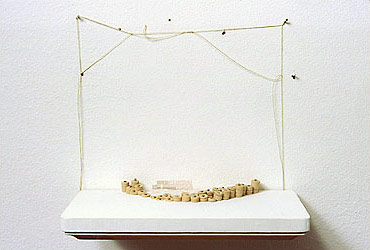 thread, anils, sequins, wallpaper on wood, 7 x 6 x 4"