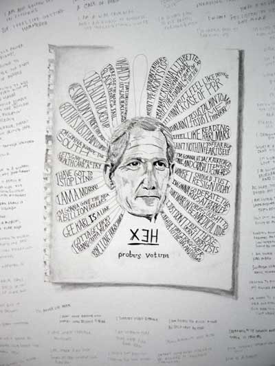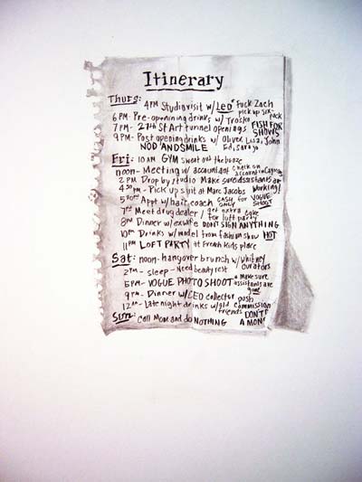 | Itinerary, 22 x 15 inches, graphite on paper, 2006 • | Hex Drawing: George W. Bush (liberal desire), 22 x 15 inches, graphite on paper, 2006 • | Hex Drawing: Zach Feuer (make me famous), 22 x 15 inches, graphite on paper, 2006 • | Hex Drawing: Robert Duffy (be kind), 22 x 15 inches, graphite on paper, 2006 | |||||||||||||||||||||||||||||||||||||||||||
