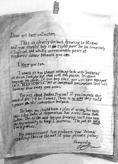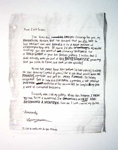 James Drawing: Goals, 22 x 15 inches, graphite and goauche on paper, 2006 • | Letter to Dana, 22 x 15 inches, graphite on paper, 2006 • | Letter to Zach, 22 x 15 inches, graphite on paper, 2006 • | Dear Art Fair Collector, 22 x 15 inches, graphite on paper, 2006 • | ||||||||||||||||||||||||||||||||||||||||||