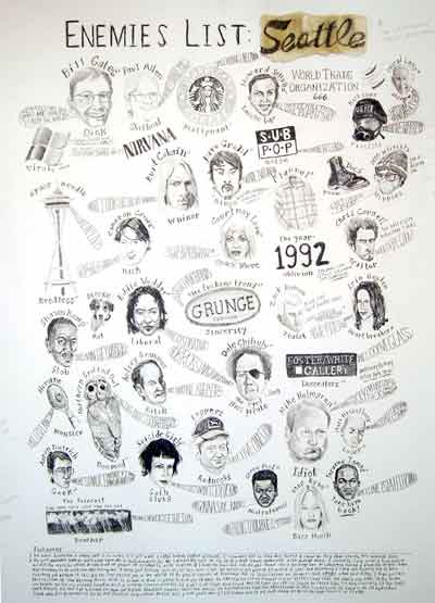 | Seattle Enemies List, 30 x 23 inches, graphite on paper, 2006 • | Cultural Memory: The Big Lebowski (unassisted), 30 x 22 inches, graphite and goauche on paper, 2005 • | Top Ten (artforum), 30 x 22 inches, graphite and goauche on paper, 2006 • | ||||||||||||||||||||||||||||||||||||||||||||