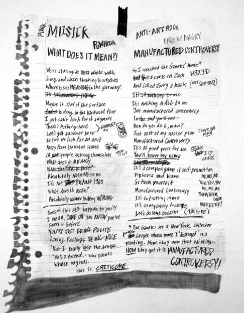 Lyric Painting (What Does it Mean?!/Manufactured Controversy) 18 x 14 inches, graphite and gouache on panel, 2008 |