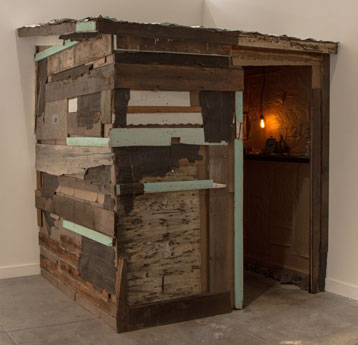 | Little Death Hollow 2013, carved poplar with stain, 27 x 22 x 3.5 inches, 34 x 25 x 41 inches overall with base |