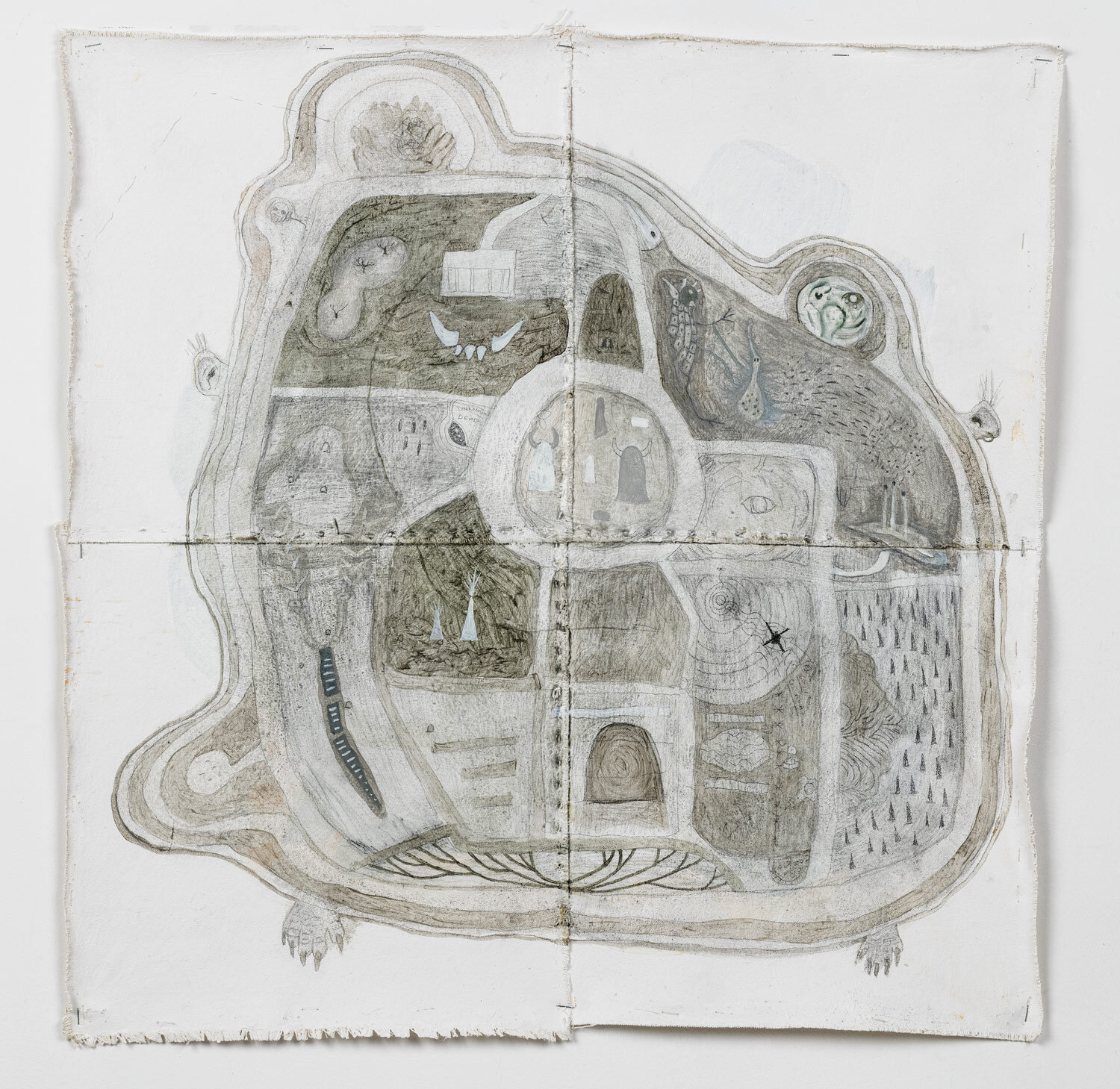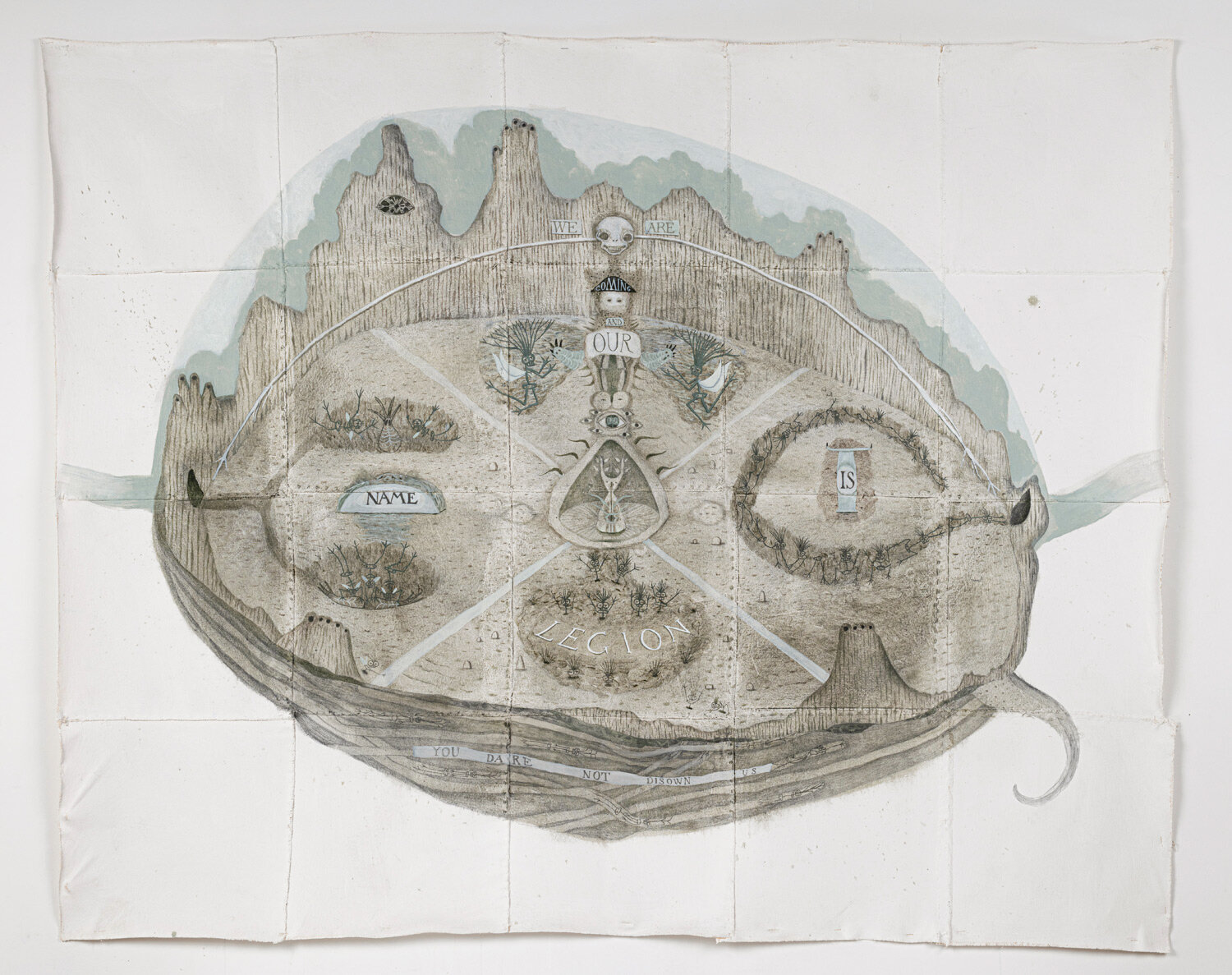 The paintings are large-scale, un-stretched canvasses designed to be folded like maps. These image-maps are of fictional memorial sites depicting land as body-territory, a feminist conceptual premise that looks at the body as a continuum of the land.