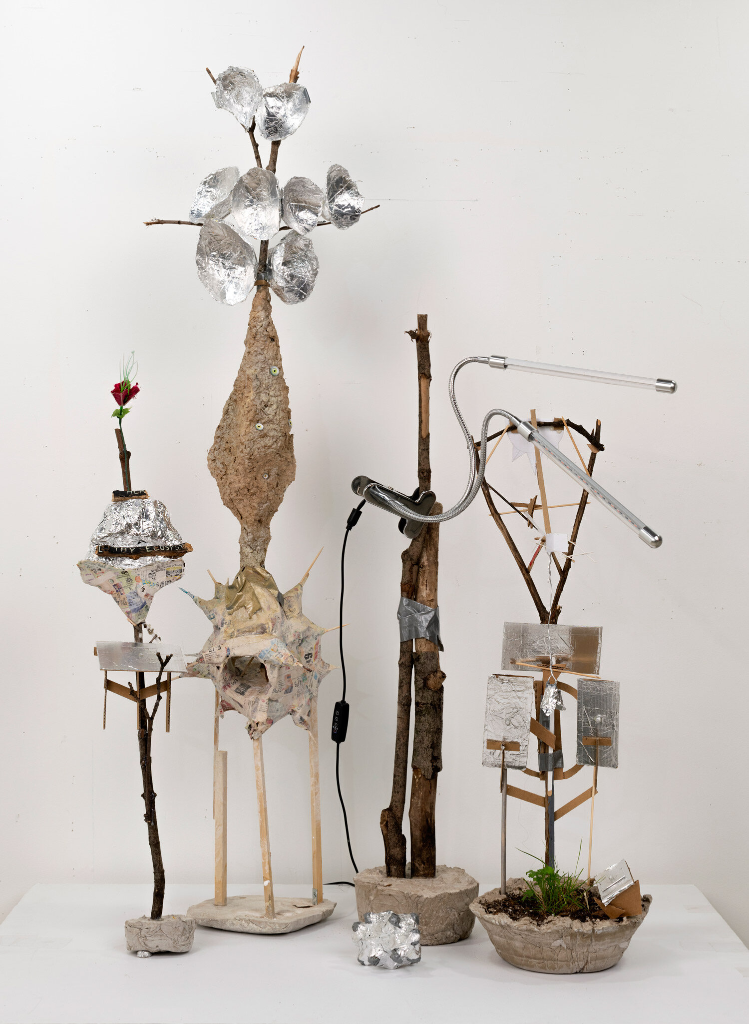 2021 (in process), sticks and artificial flowers from All Faiths Cemetery, cement, potting soil, Sagebrush, and Wormwood plant from the Artemisia family with human DNA collected at burial site, pulp (from recycled cardboard with plaster leaf clippings, and catnip), doll eyeballs, papier-mâché, spray paint, insulation tape, wood, cardboard, grow light, 48h x 36w x 18d inches, NFS