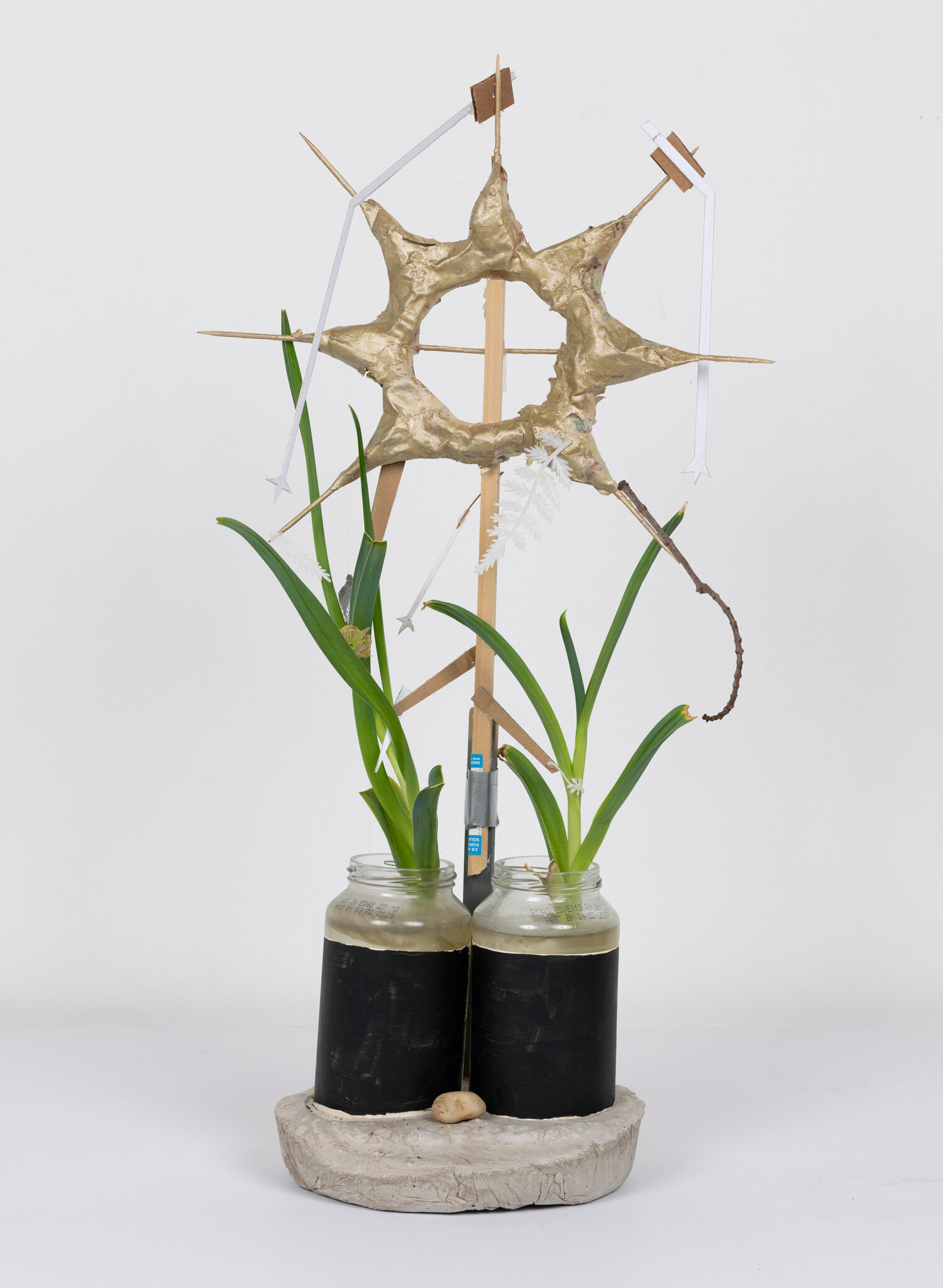 2021, sticks and artificial flowers from All Faiths Cemetery, cement, potting soil, Mugwort, Sagebrush, and Wormwood seeds with human DNA collected at burial site, stone from soil displaced by gravediggers, papier-mâché, spray paint, insulation tape, wood, cardboard, recycled jars, water, leeks, 32h x 36w x 12d inches, NFS
