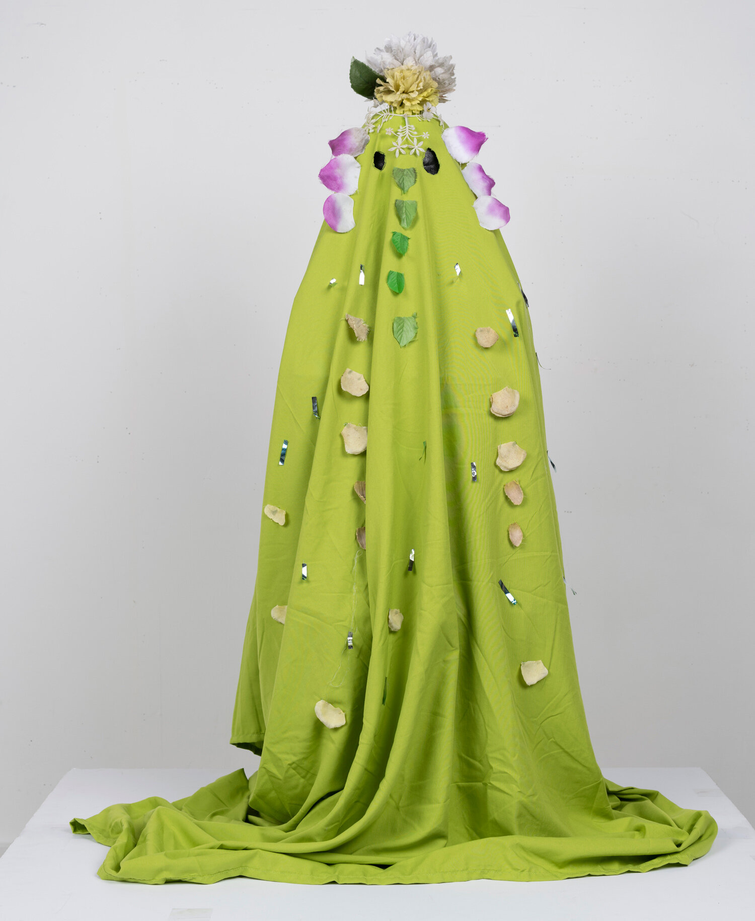2021, green bedsheet, artificial flowers and tinsel from All Faiths Cemetery, hot glue, dimensions variable, NFS