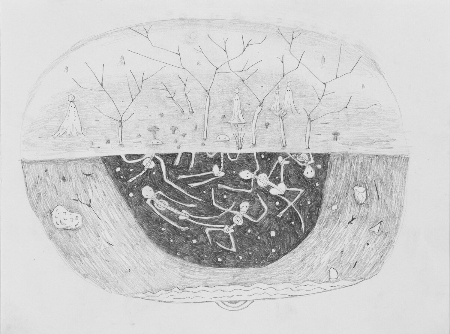 The psychic, corporeal maps of the cemetery are a way to think about the confluence of body and land, as well as the feminist idea of communal burial sites as “body territory,” where land becomes an extension of the human body. Meditation on time can be surreal in this space, and I think of these maps/landscapes/figures as showing All Faiths at multiple different times that exist concurrently and flow from one to another.