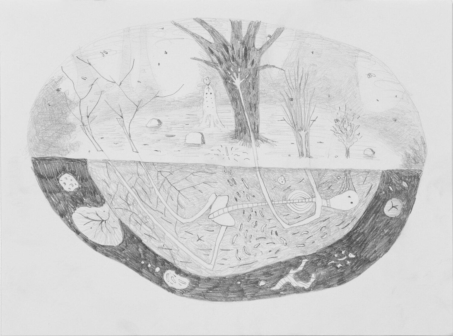 This work owes a debt to New Materialists scholars whose research spans biology, philosophy, and feminist anthropology, particularly Donna Haraway and Anna Tsing. Their work has taught me much about human and multispecies entanglement. They question the centrality of ”Enlightenment Man”, the idea that places each human individual at the center of their own universe, creates us in the image of a disembodied eye centered in an imperial world of Cartesian geometry. It is this that separates us from the living world and allows us to see our surroundings as a resource to be consumed rather than a series of living, intertwined entities that support life on Earth. These devices, maps, and actions are part of a long slow process of unlearning what I have been taught about death, time, and being in the world.