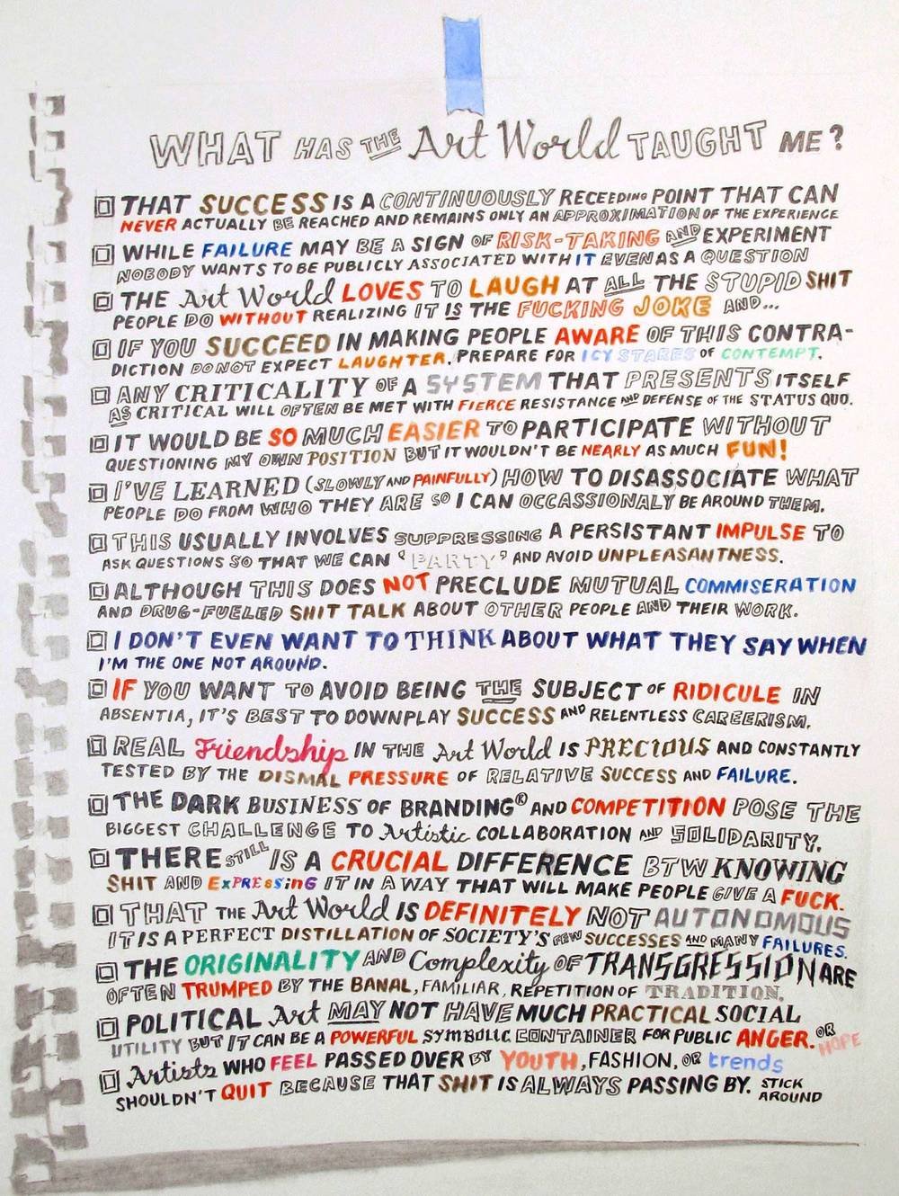 William Powhida What Has The Art World Taught Me?, 2014, oil on canvas copied in Shenzhen China from a slide provided by the artist, 22 x 30 inches