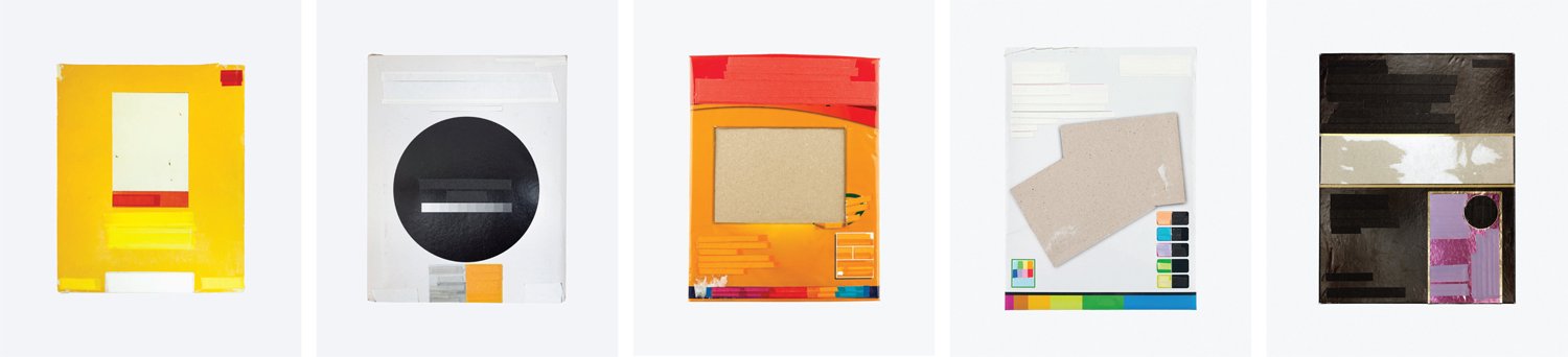 “Standard Size began as a playful act of resistance against the typical example photos on packages of ink jet paper. To purge this information from view, the stock photos and other imagery are physically removed from the packages, and the marketing text is covered up with colored masking tape. Each modified surface is then lit and re-photographed to emphasize the gestures of redaction. The result is a series of flat compositions that reconsider the creative opportunities held in the materials themselves.”