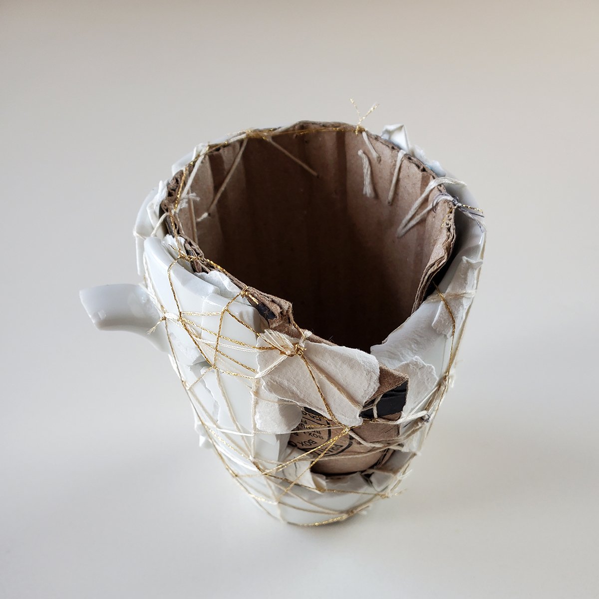 Front of House, 2023, found ceramic shards, thread, paper, graphite, tape