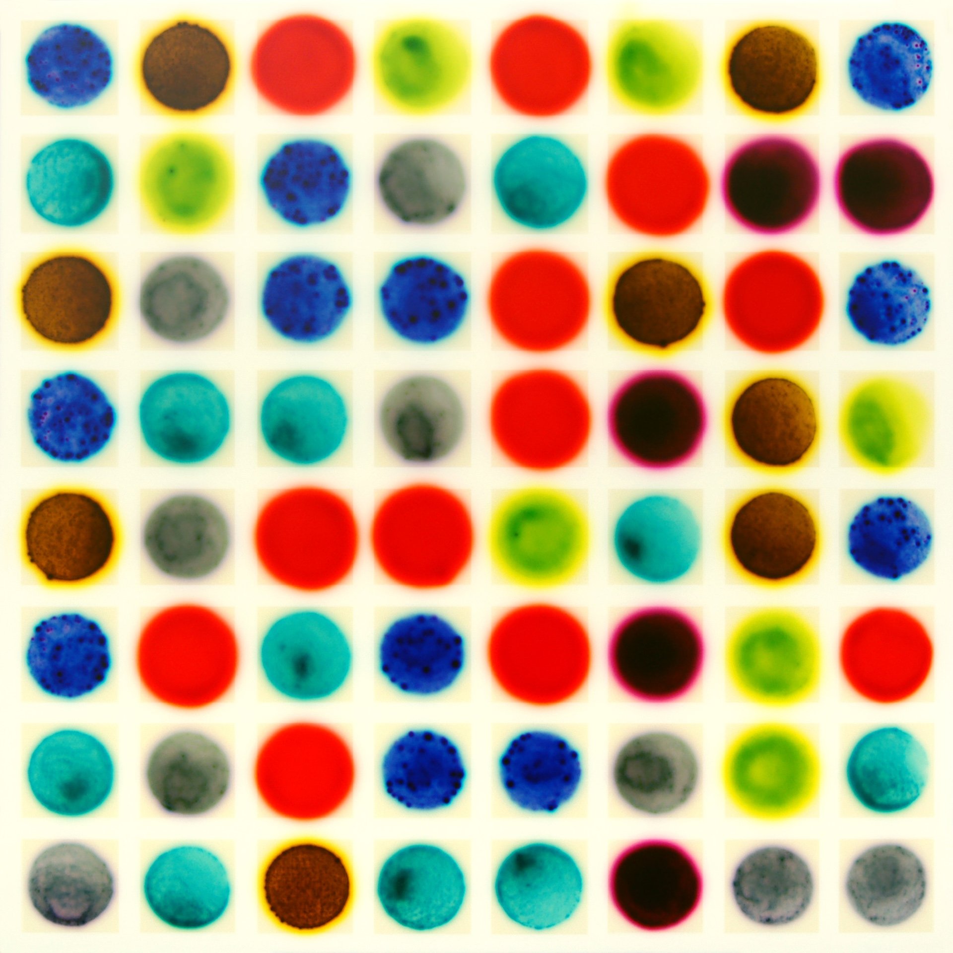 Jaq Chartier 64 Tests (match-3), acrylic, stains, and spray paint on panel, 23 x 23 inches (Private Collection)