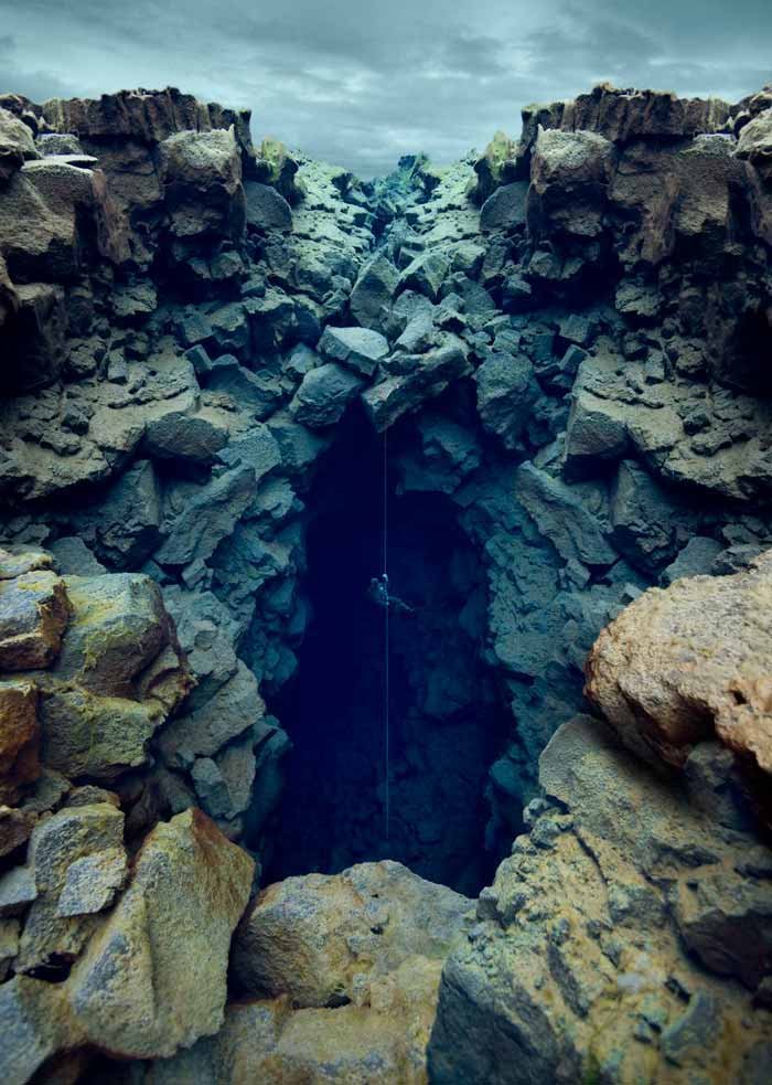 The images in this series are of constructed landscapes, ideals that never existed, at least not precisely as they are presented. In the tradition of landscape painting the foreground of each image includes a single figure of a mountaineer complete with 1970s era costume and equipment. Over the course of the series the mountaineer descends ever deeper into what seems to be some kind of nether world of blue caves and canyons. These images were created from photographs made of underwater landscapes at Silfra, a unique location in Iceland. The fact that the original photographs were taken under water in some of the clearest and coldest water on earth creates subtly modulated lighting. All other clues to the origins of the images have been removed, for instance in most images the surface of the water above has been replaced with clouds photographed elsewhere in Iceland.