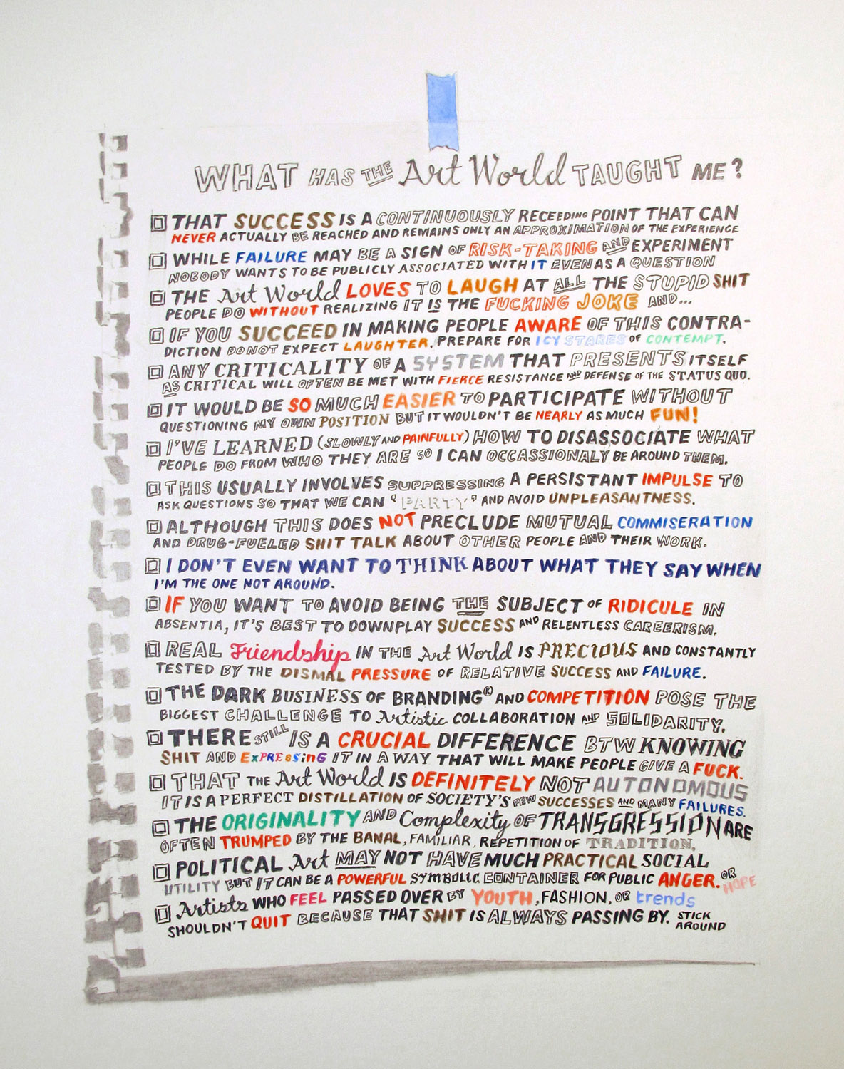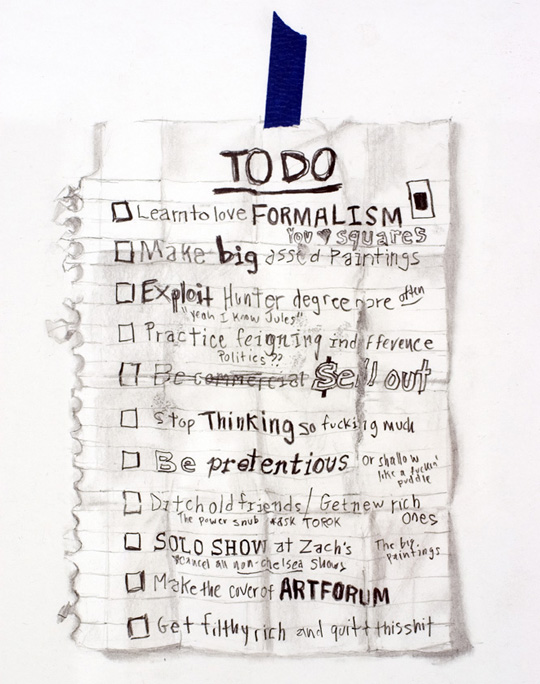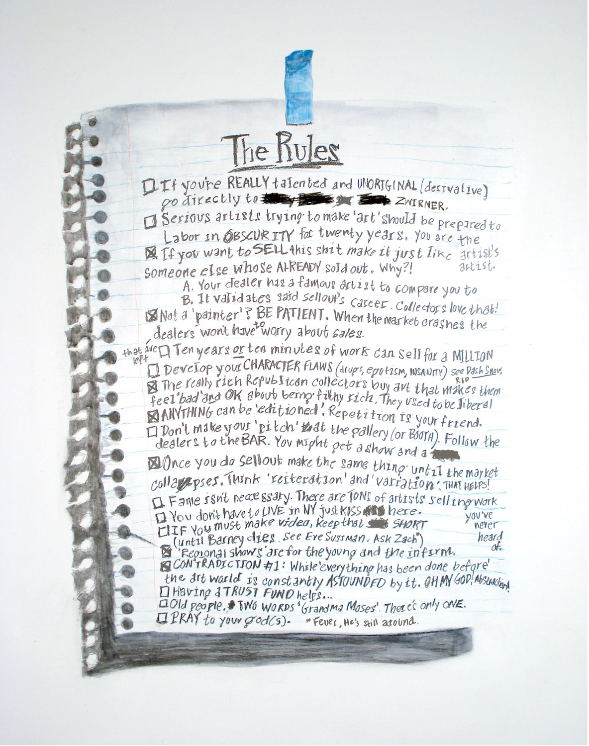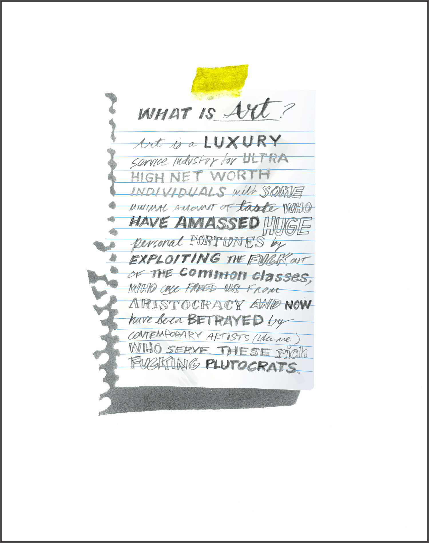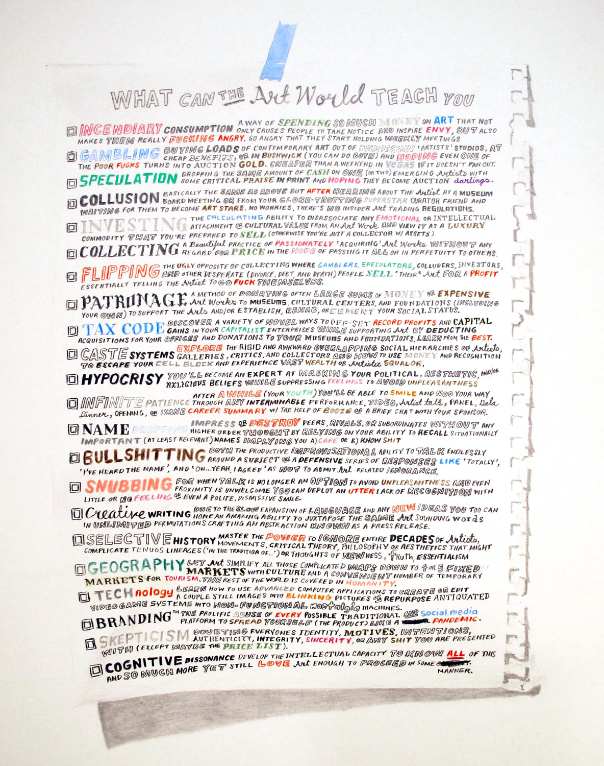 William Powhida makes work from his observations of the art world, creating “art criticism” in graphic form. Through trompe l’oeil painting and drawings on paper emulating notes, letters, enemies lists, rants, to-do lists, Powhida’s fictional artistic personality goads, cajoles, critiques, insults, complains, and articulates life as a contemporary artist in a market-driven economy.
