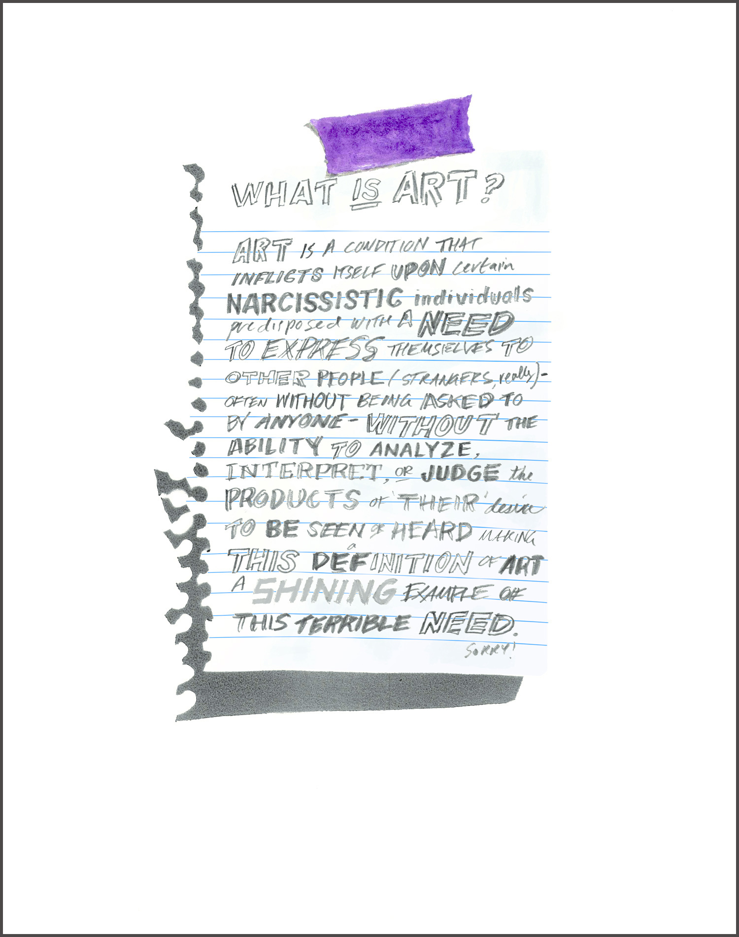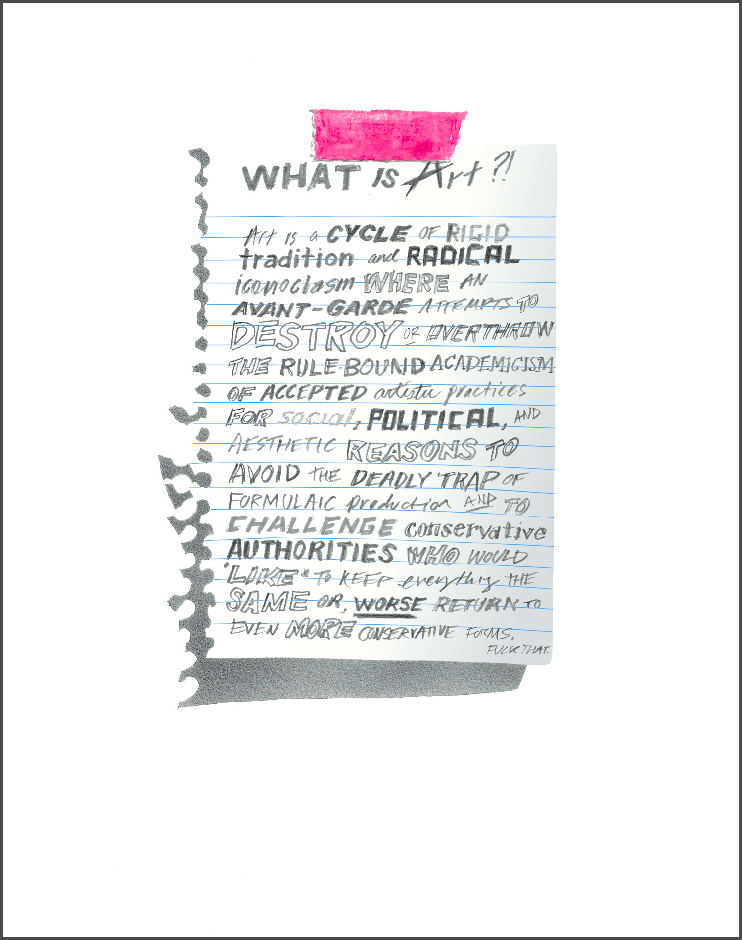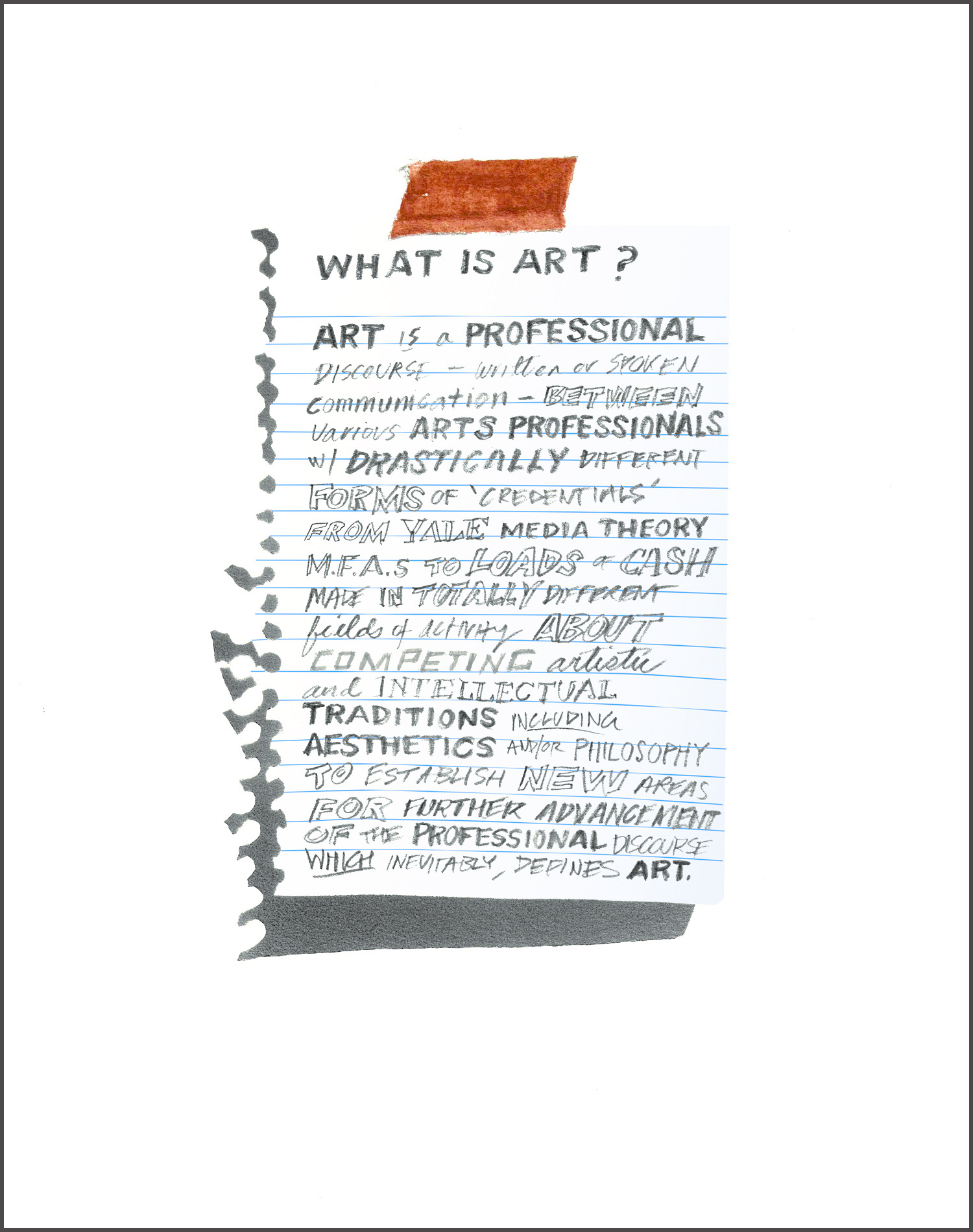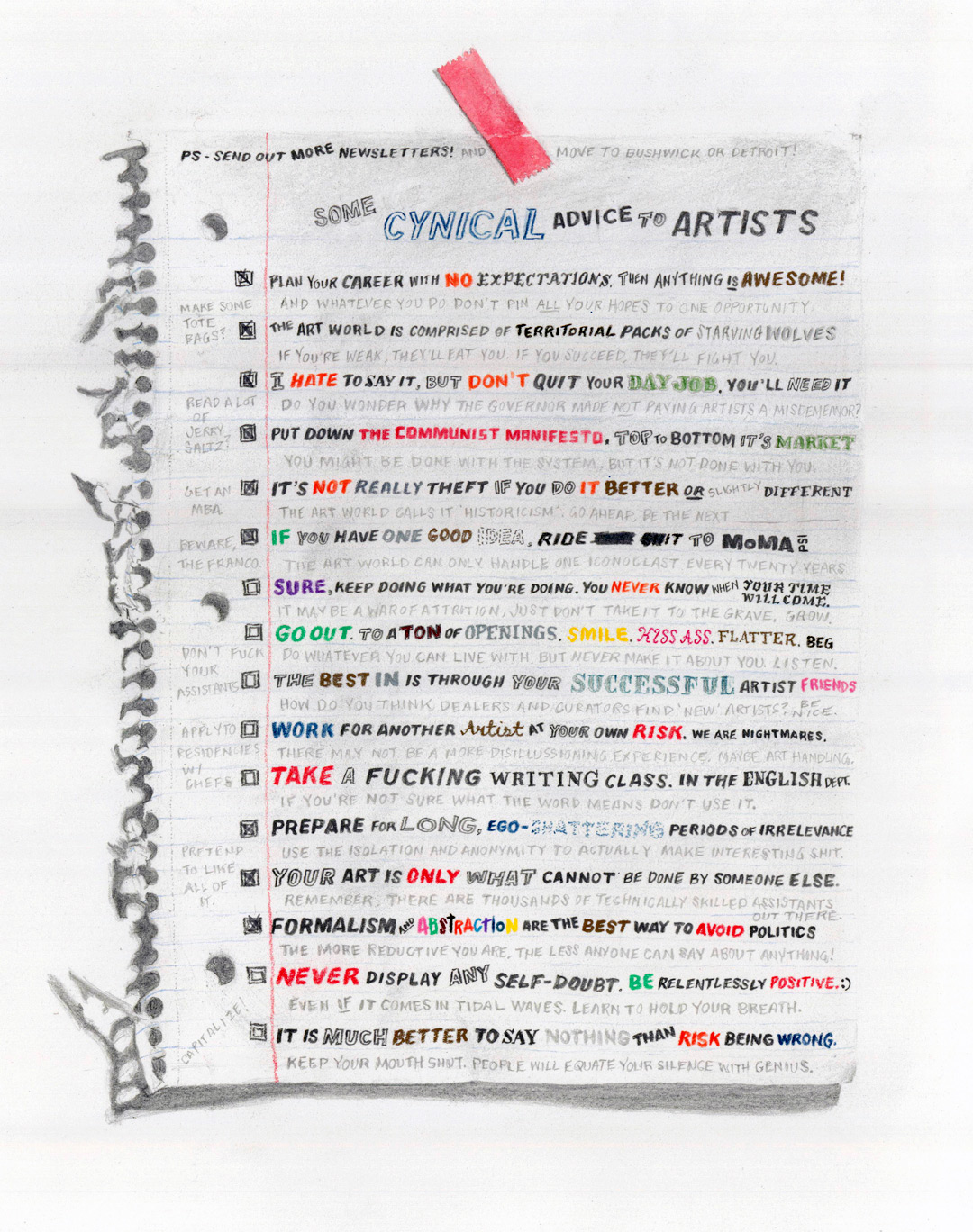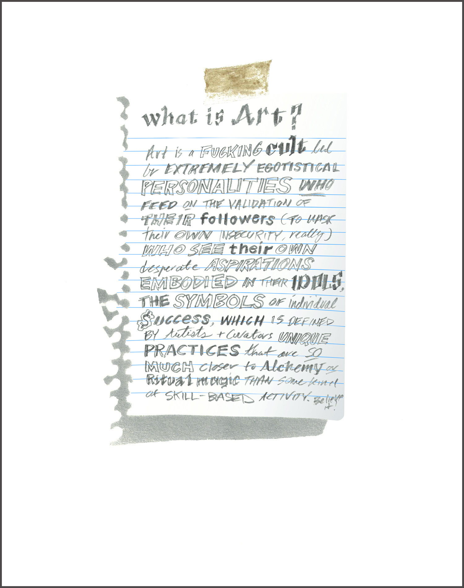 William Powhida makes work from his observations of the art world, creating “art criticism” in graphic form. Through trompe l’oeil painting and drawings on paper emulating notes, letters, enemies lists, rants, to-do lists, Powhida’s fictional artistic personality goads, cajoles, critiques, insults, complains, and articulates life as a contemporary artist in a market-driven economy.