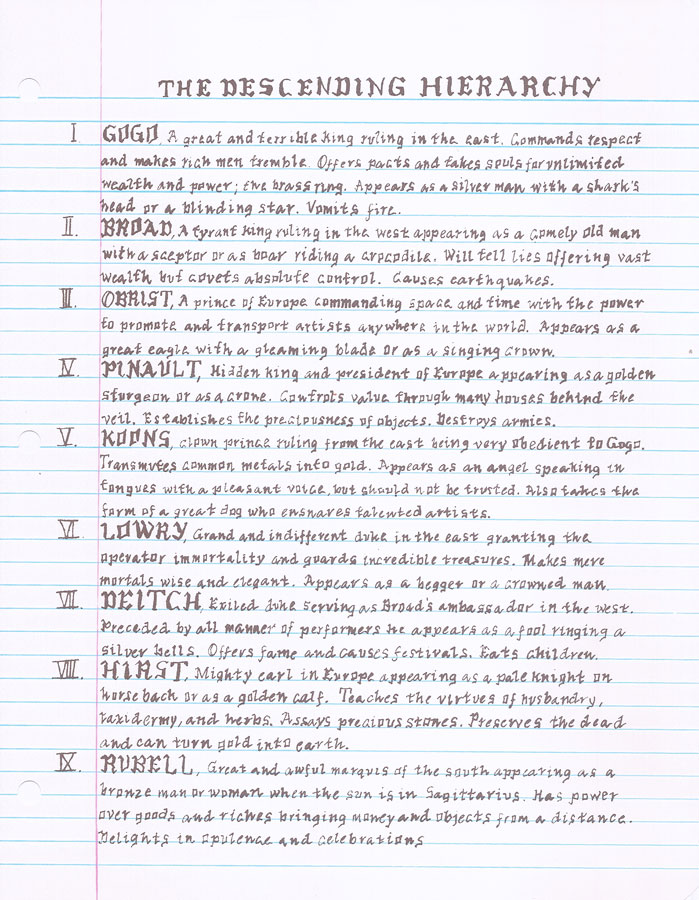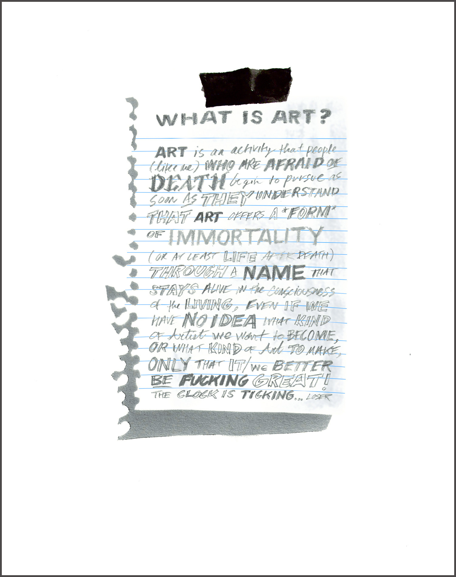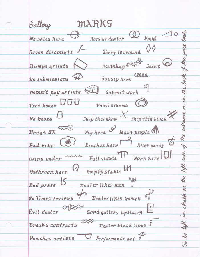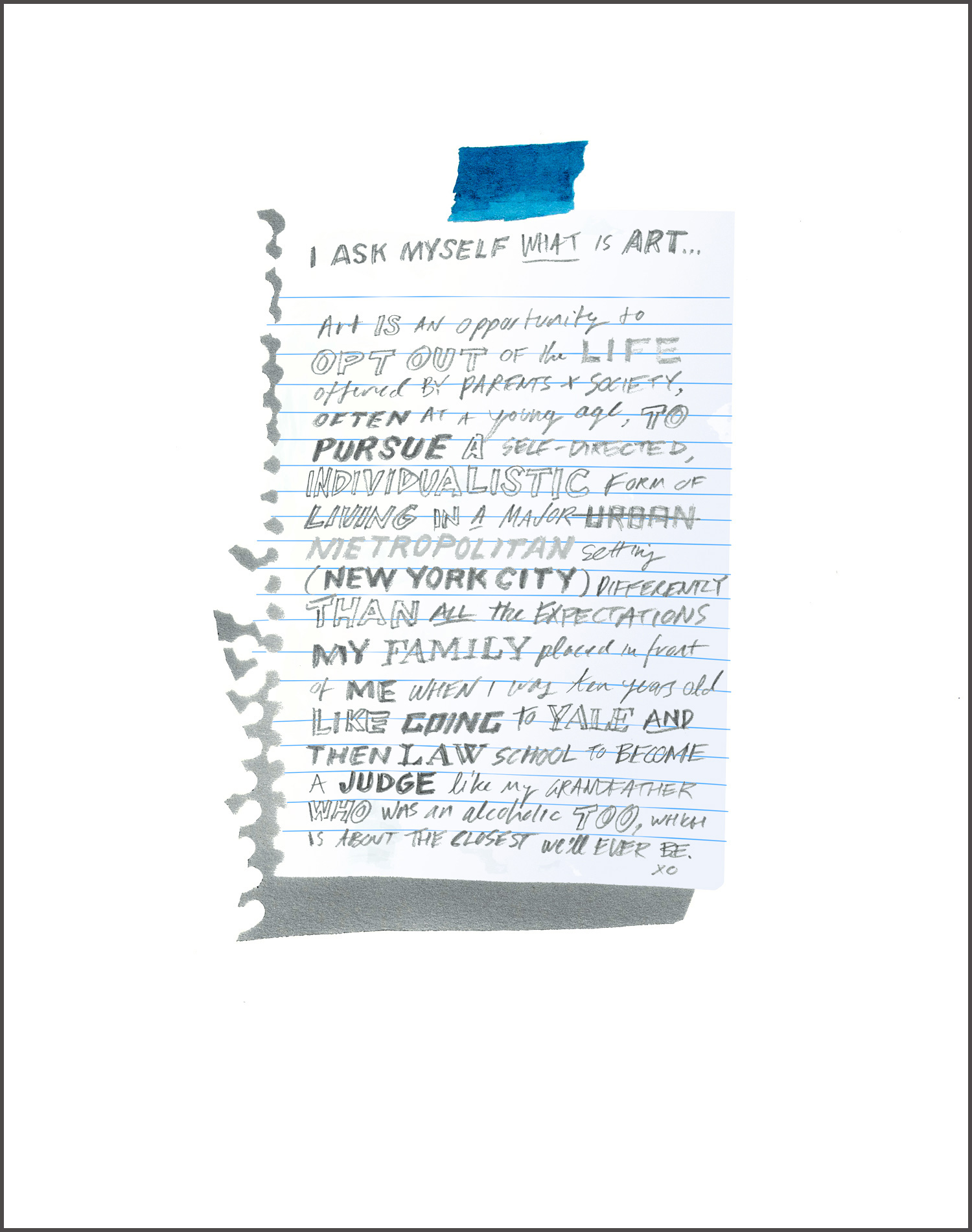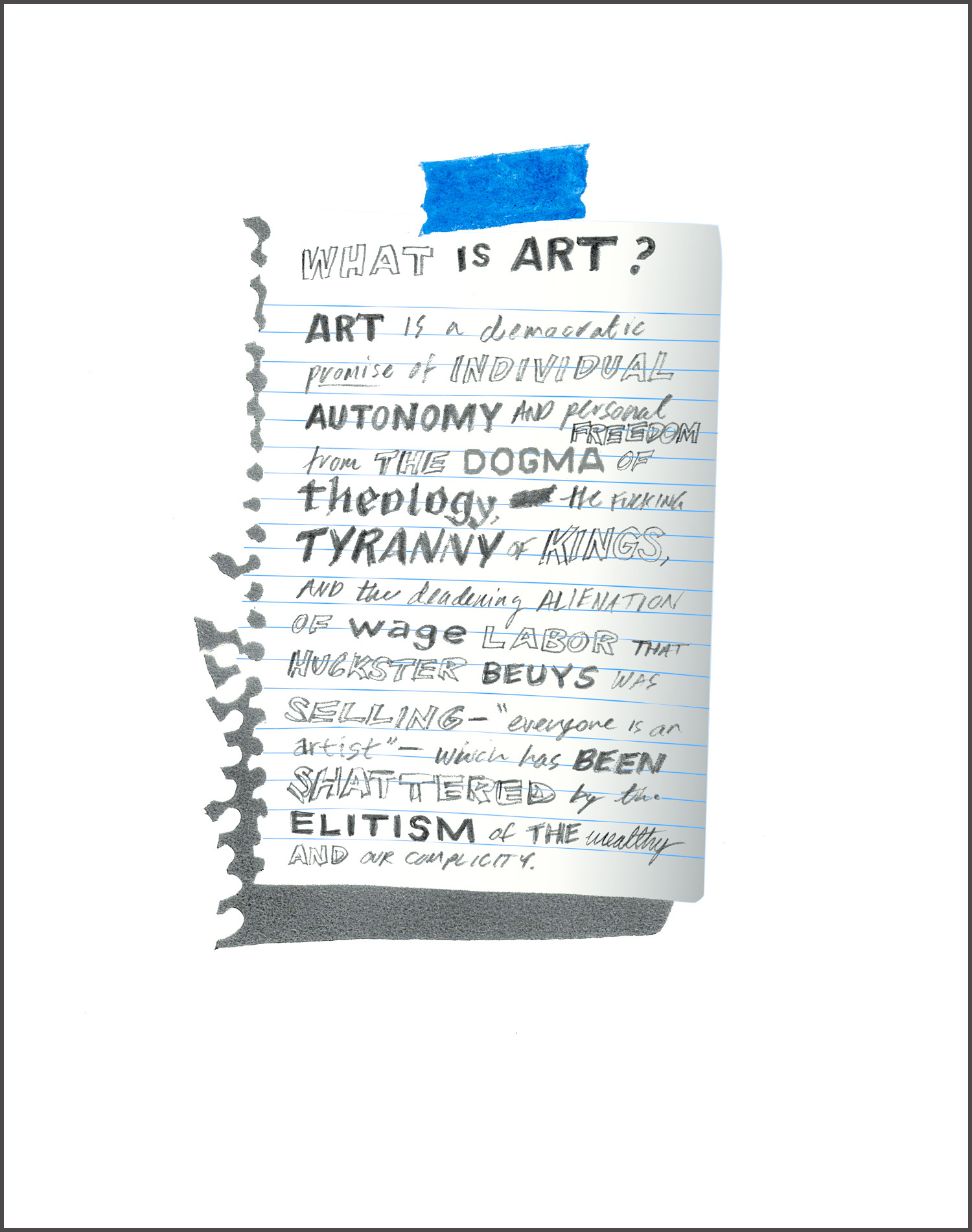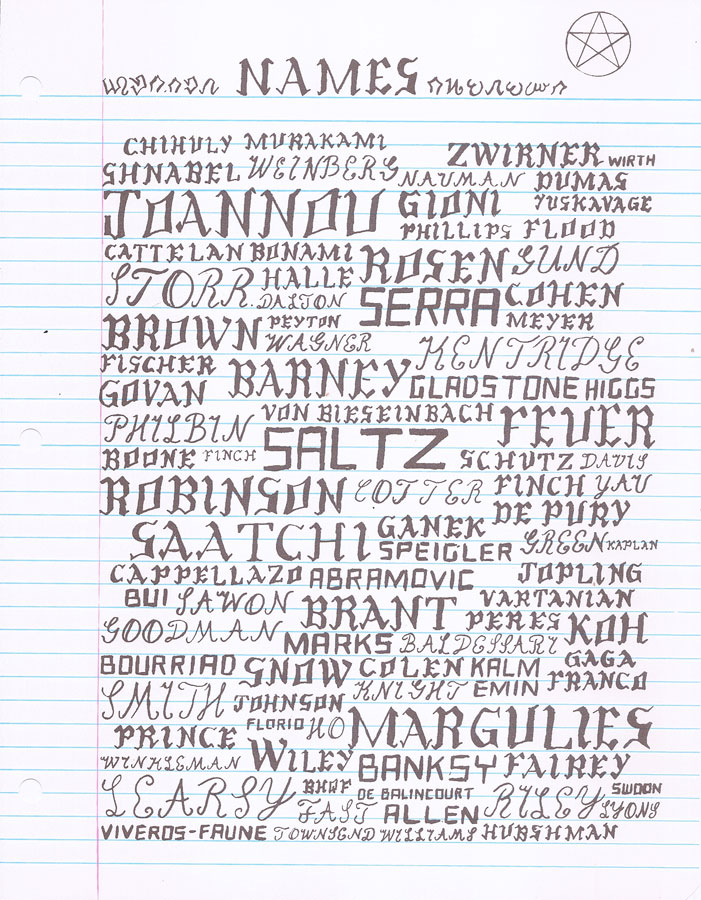William Powhida makes work from his observations of the art world, creating “art criticism” in graphic form. Through trompe l’oeil painting and drawings on paper emulating notes, letters, enemies lists, rants, to-do lists, Powhida’s fictional artistic personality goads, cajoles, critiques, insults, complains, and articulates life as a contemporary artist in a market-driven economy.