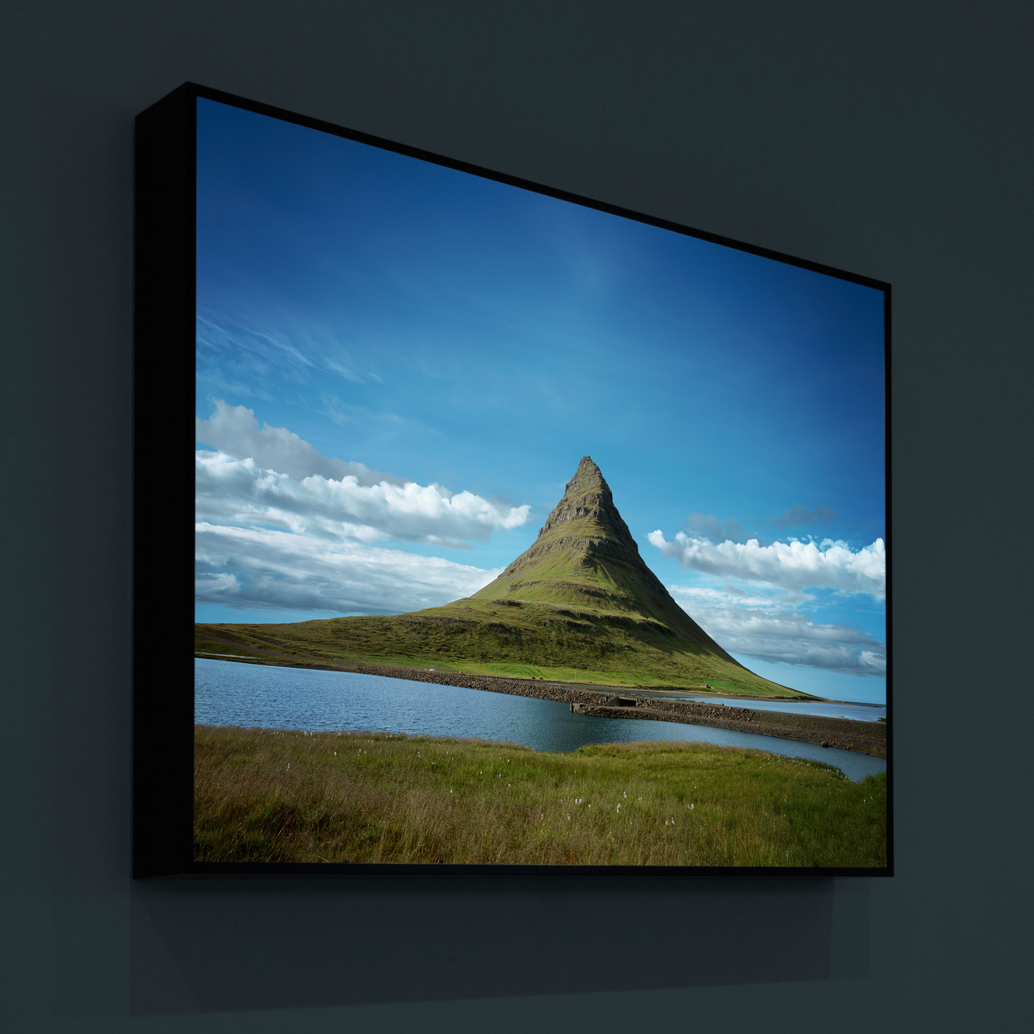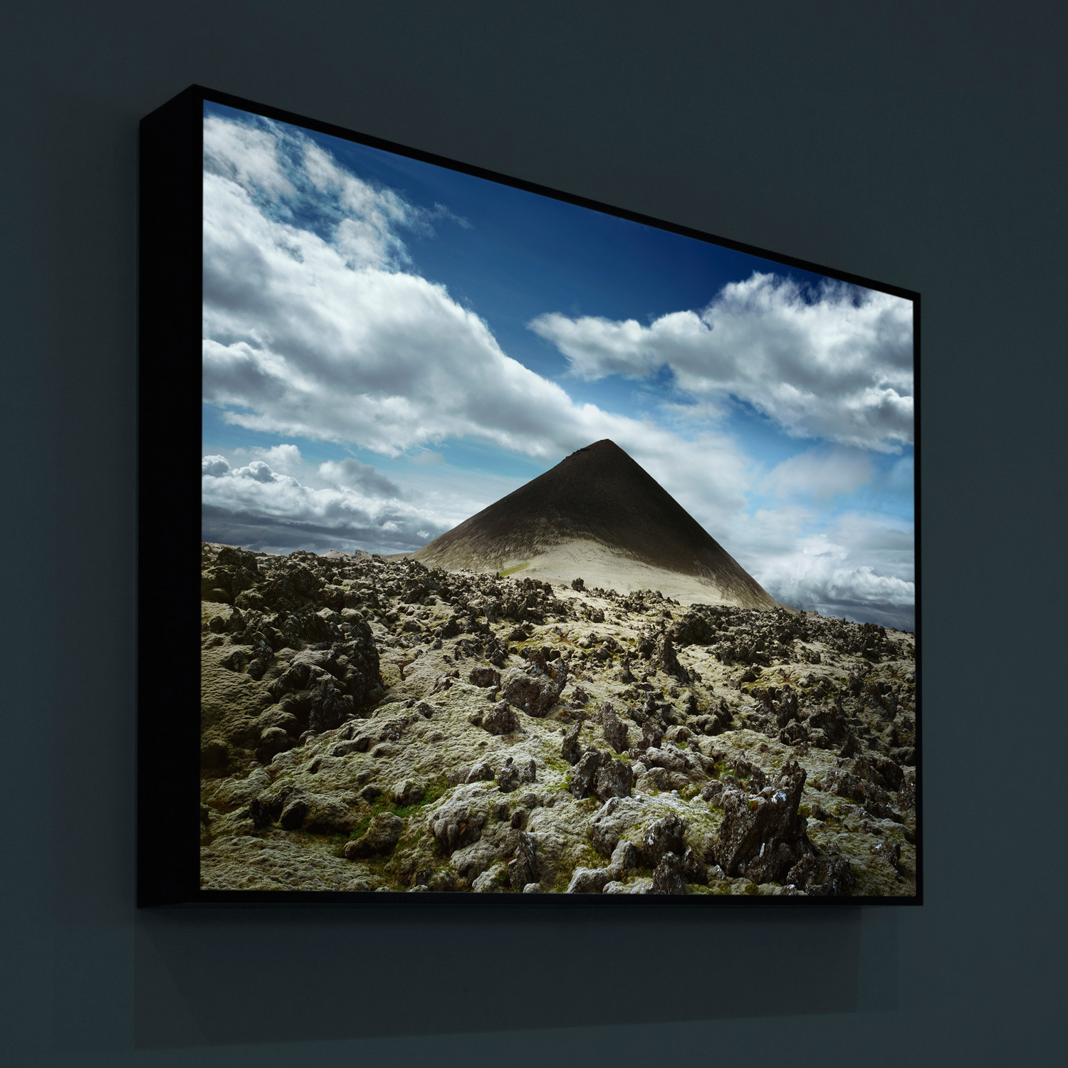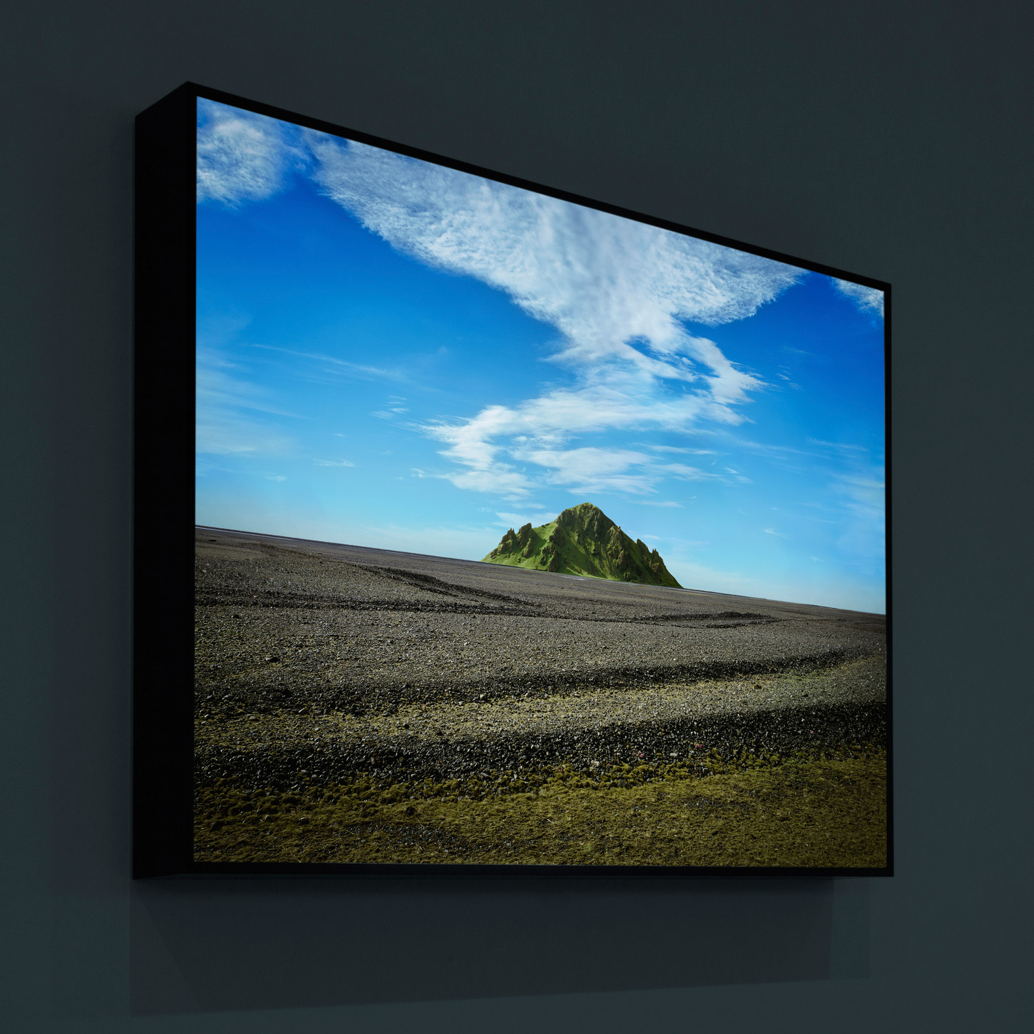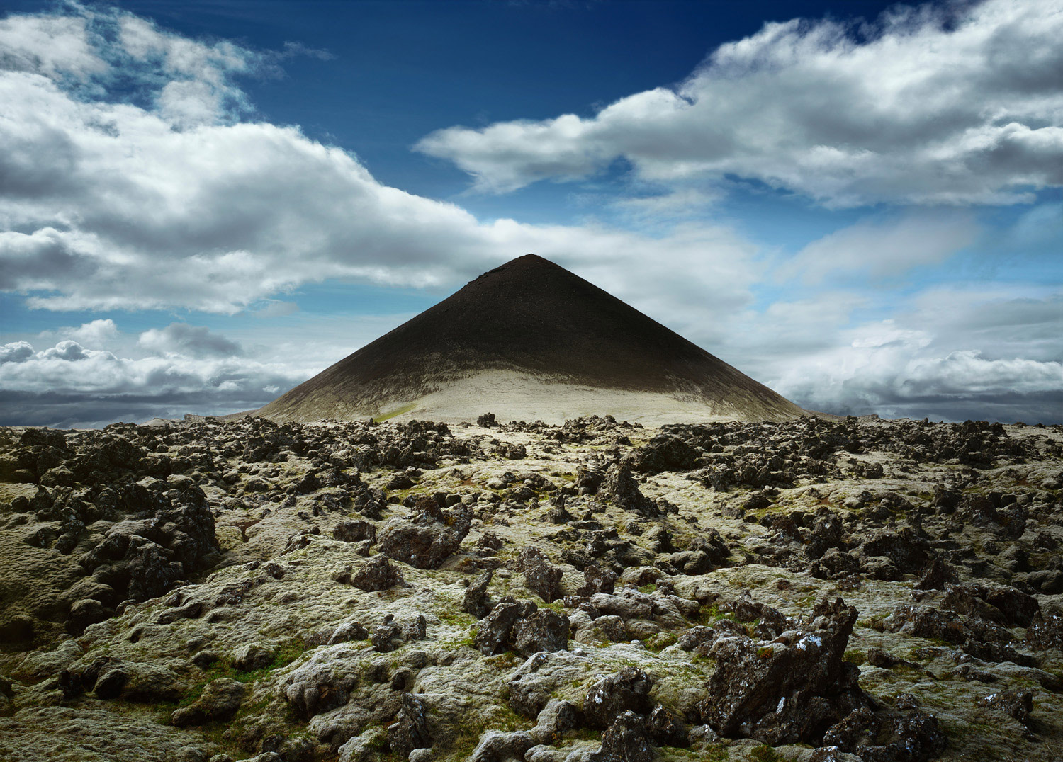 This series of five digital images of generic mountains was generated from photographs of lava cone formations in Iceland. The images have been manipulated to render the mountain forms perfectly symmetrical for part of their height. These are not images of particular mountains, but diagrams of the concept “Mountain” realized as iconic conical forms. It has been exhibited at the Madison Museum of Contemporary Art (Madison, WI), and the Minnesota Marine Art Museum (Winona, MN).
