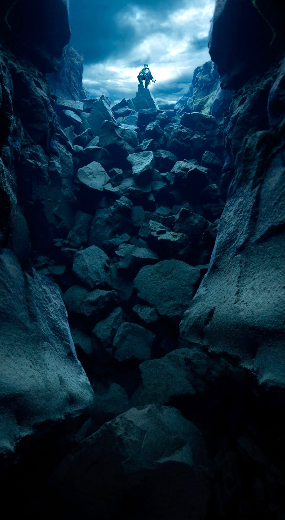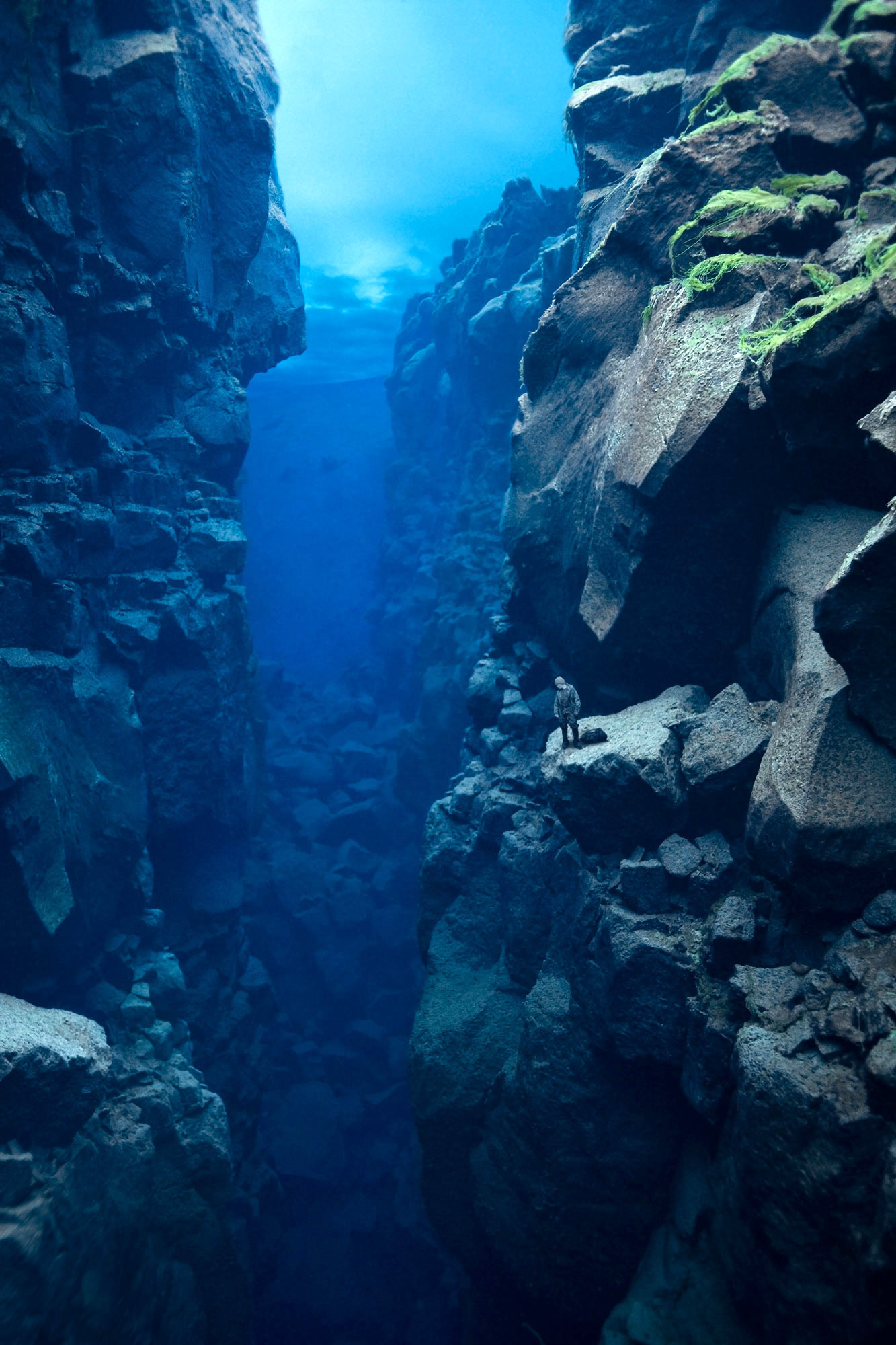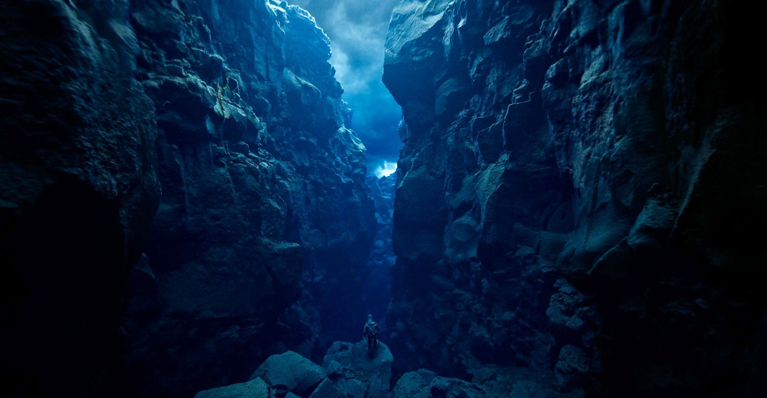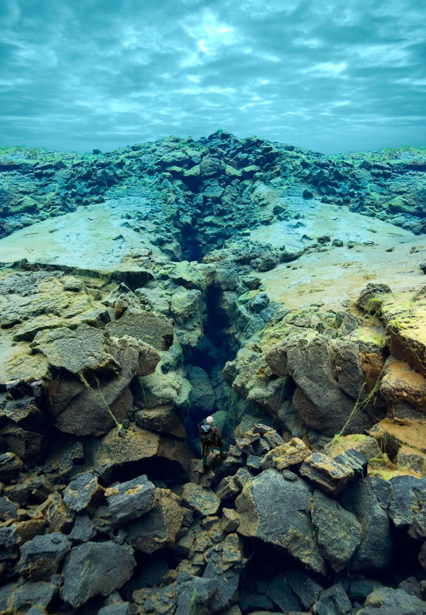 The images in this series are of constructed landscapes, ideals that never existed, at least not precisely as they are presented. In the tradition of landscape painting the foreground of each image includes a single figure of a mountaineer complete with 1970s era costume and equipment. Over the course of the series the mountaineer descends ever deeper into what seems to be some kind of nether world of blue caves and canyons. These images were created from photographs made of underwater landscapes at Silfra, a unique location in Iceland. The fact that the original photographs were taken under water in some of the clearest and coldest water on earth creates subtly modulated lighting. All other clues to the origins of the images have been removed, for instance in most images the surface of the water above has been replaced with clouds photographed elsewhere in Iceland.