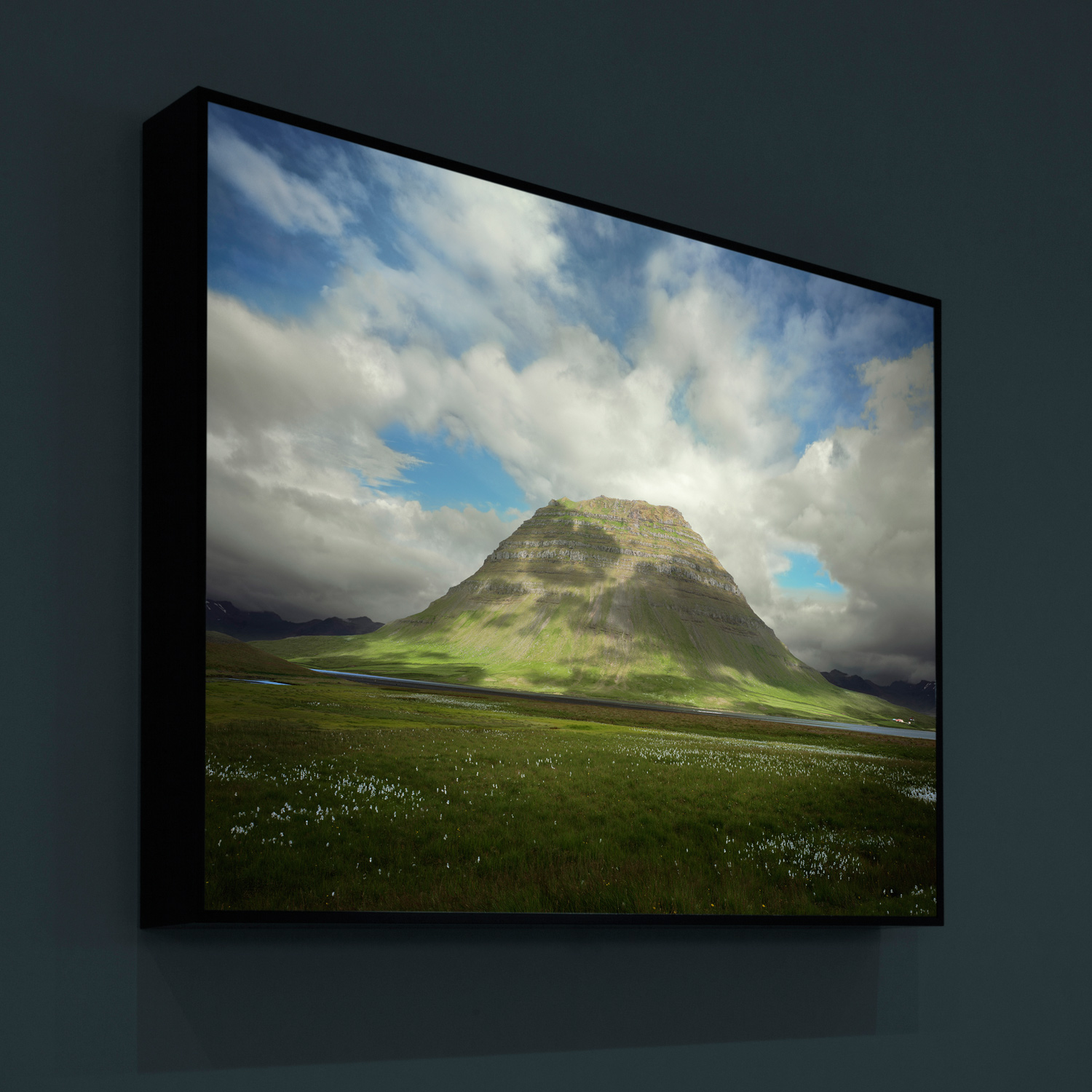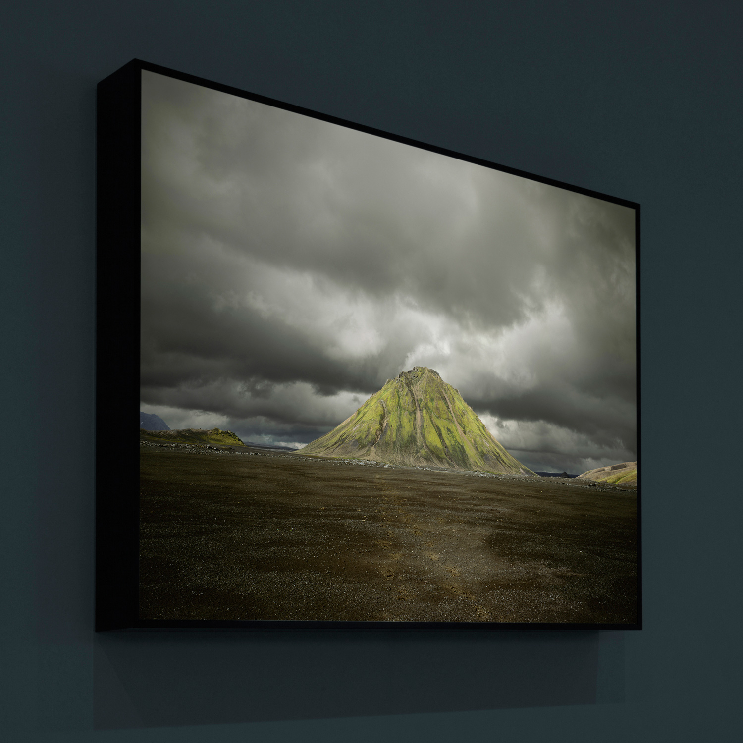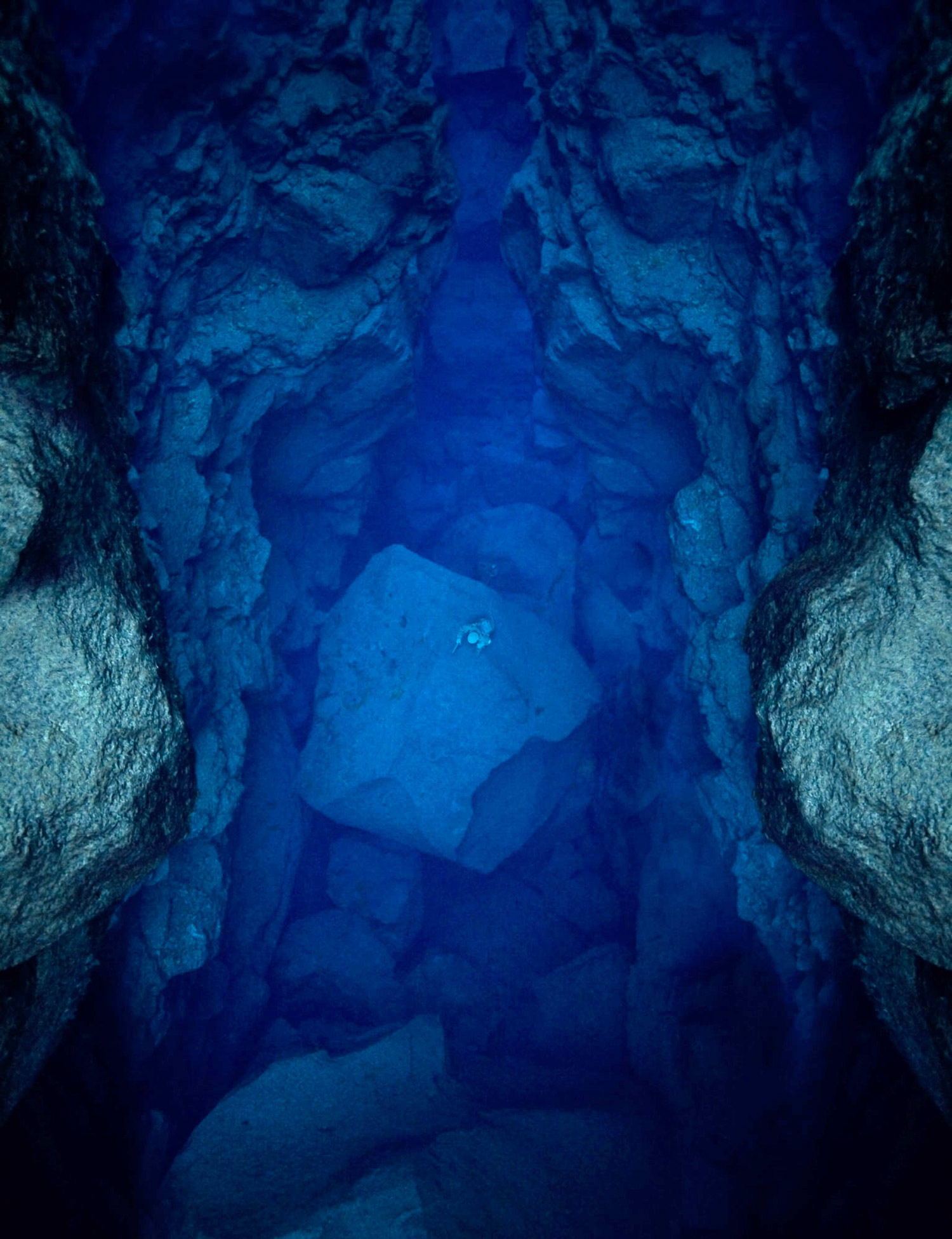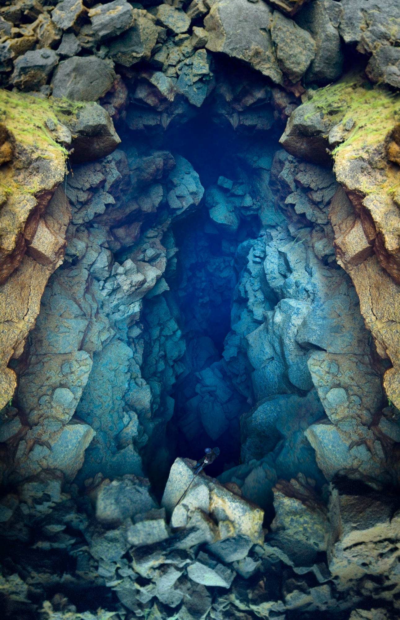 The images in this series are of constructed landscapes, ideals that never existed, at least not precisely as they are presented. In the tradition of landscape painting the foreground of each image includes a single figure of a mountaineer complete with 1970s era costume and equipment. Over the course of the series the mountaineer descends ever deeper into what seems to be some kind of nether world of blue caves and canyons. These images were created from photographs made of underwater landscapes at Silfra, a unique location in Iceland. The fact that the original photographs were taken under water in some of the clearest and coldest water on earth creates subtly modulated lighting. All other clues to the origins of the images have been removed, for instance in most images the surface of the water above has been replaced with clouds photographed elsewhere in Iceland.